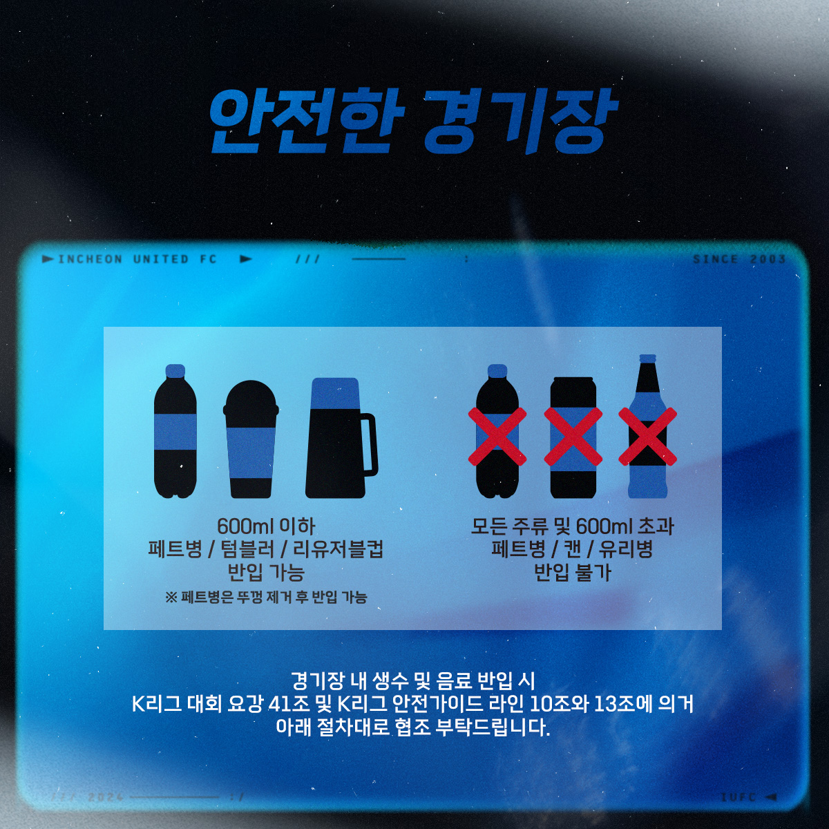 K리그 안전가이드 라인 13조에 따라 우리 구단은 홈 경기 당일 경기장 물품 반입에 대한 관리 감독을 철저하게 진행하고 있습니다. 경기장 입장 시 연맹과 구단이 정한 물품인 캔 및 유리병, 600mL를 초과하는 페트병 같은 위험 요소가 있는 물품과 기타 안전과 경기 진행에 지장을 초래할 것으로 판단되는 물품의 반입은 전면 금지됩니다.