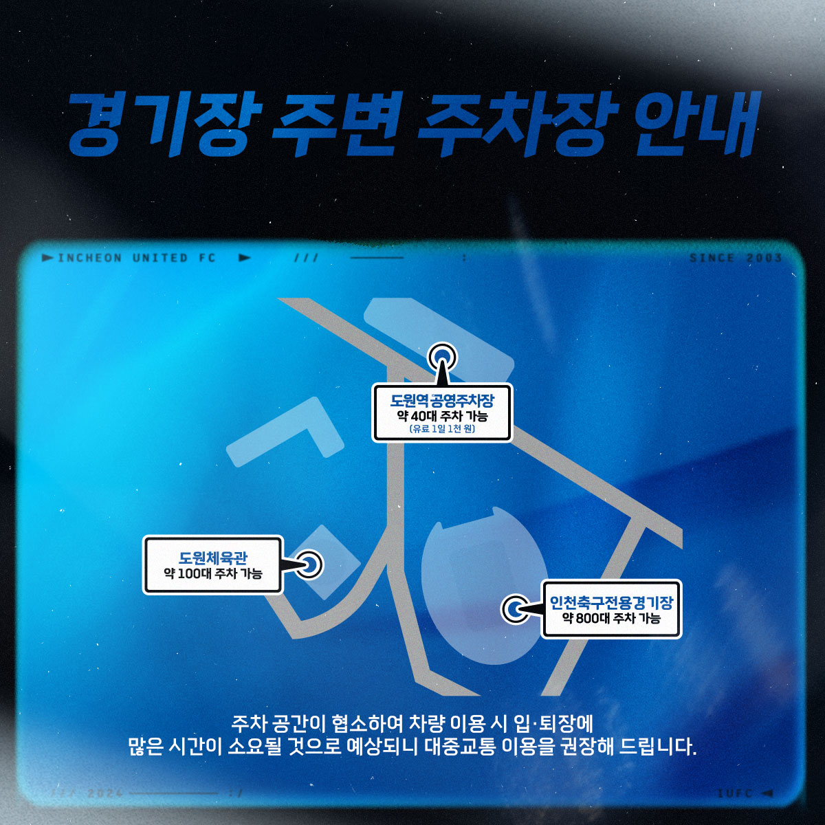※ 홈경기 당일 관람객이 몰리고 주차 구역이 협소하여 현장 주차가 힘들 것으로 예상됨에 따라 대중교통을 이용해주시기 바랍니다!