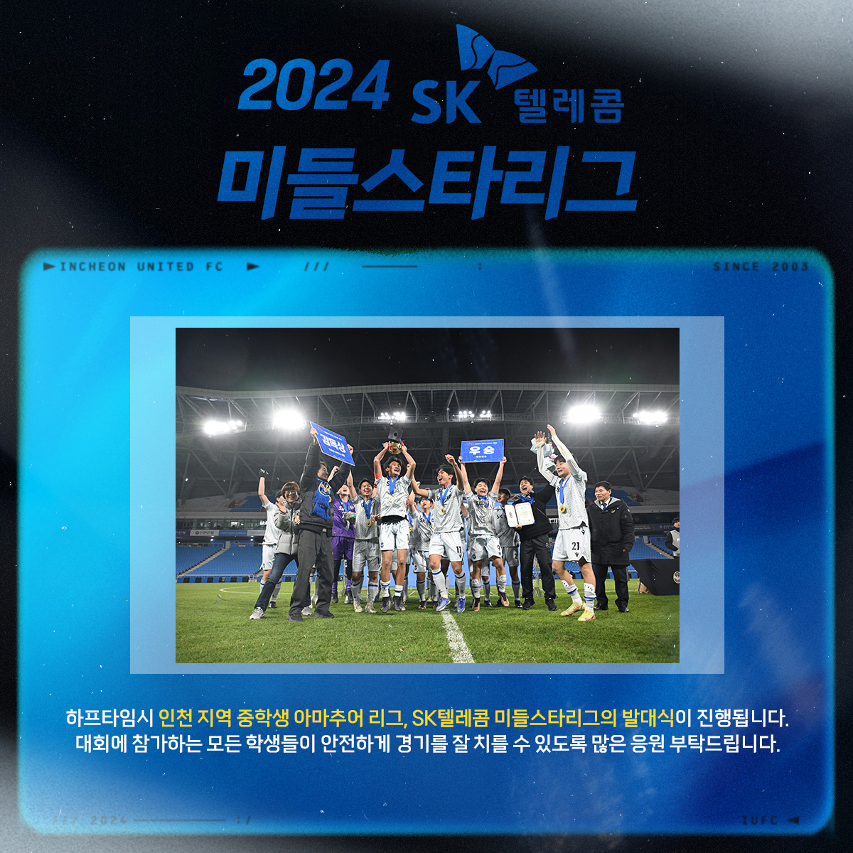 인천 지역 순수 아마추어 중학생이 참가하는 '20년 역사', '국내 최대 규모'의 SK텔레콤 미들스타리그 발대식이 울산전 홈 경기 하프타임에 진행됩니다!