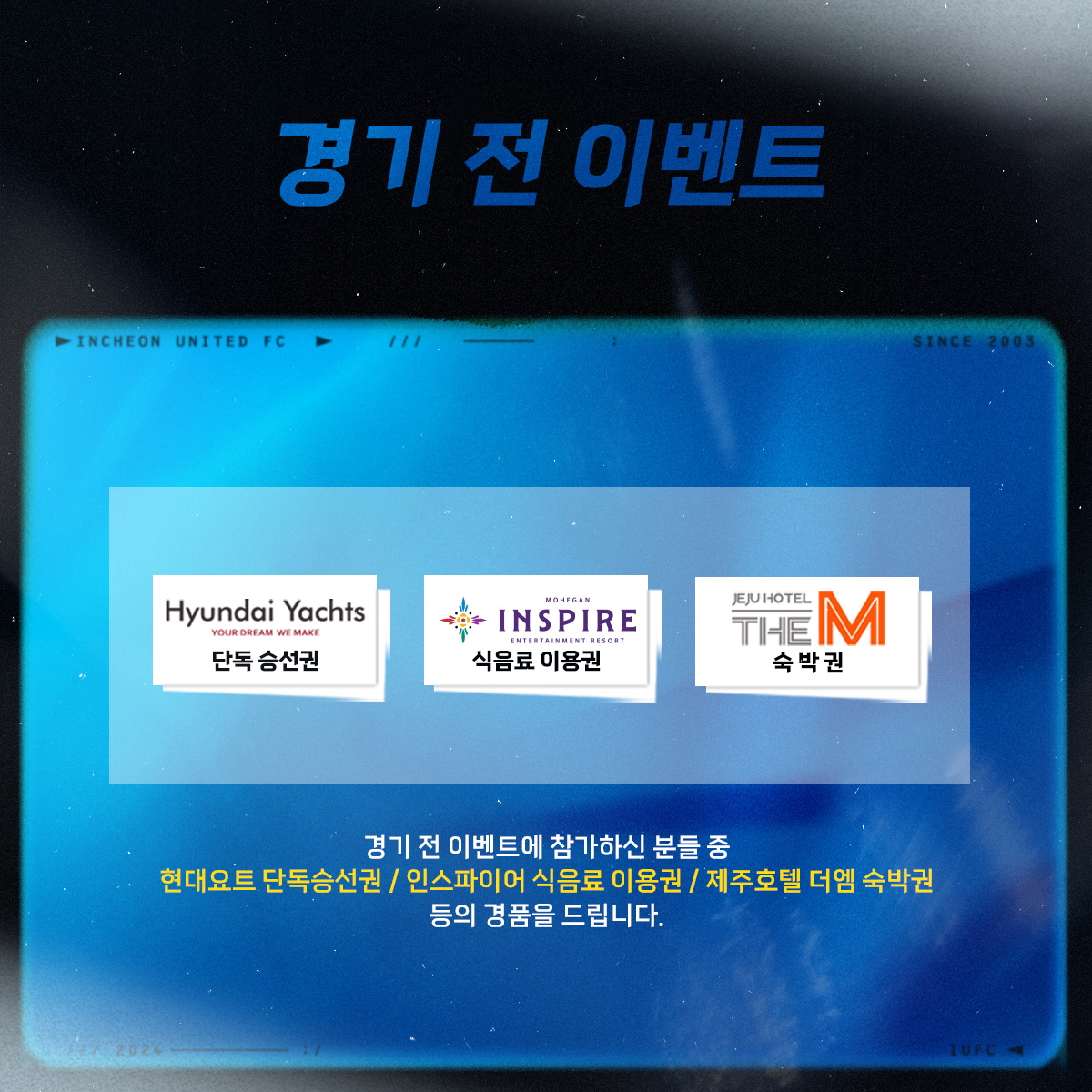 경기 전 이벤트를 통해 현대요트 단독승선권, 인스파이어 식음료 이용권, 제주호텔 더엠 숙박권 등의 경품을 드리니 많은 참여바랍니다.