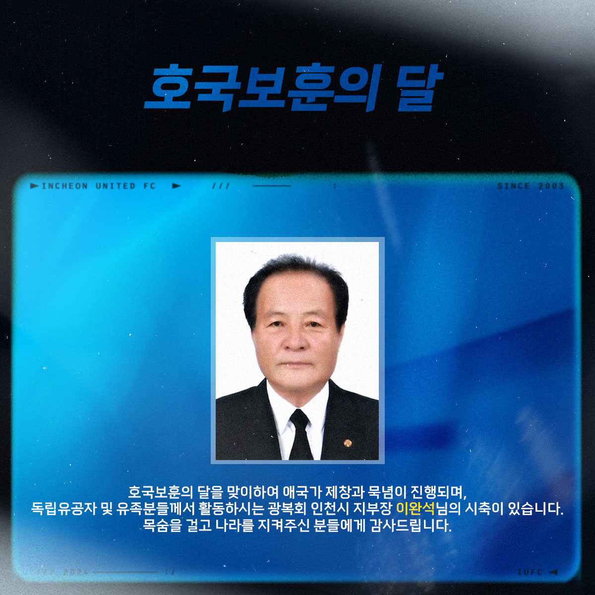 호국보훈의 달을 맞이하여 경기 전 애국가 제창과 묵념이 진행되며, 독립유공자 및 유족분들께서 활동하시는 '광복회' 인천시 지부장 이완석 님의 시축이 진행될 예정입니다.