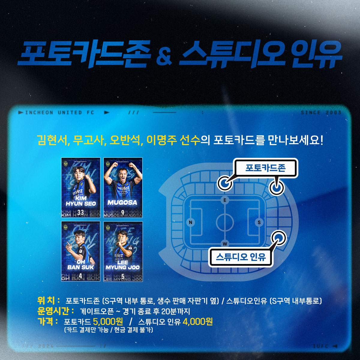 ※ 경기 시간(18:00~19:45)에는 매장 재정비를 위해 운영되지 않습니다. 단, 하프타임 시간에는 운영됩니다.▶ 티켓구매 : https://iufc.kr/ti▶ 유선문의 : 032-880-5524
