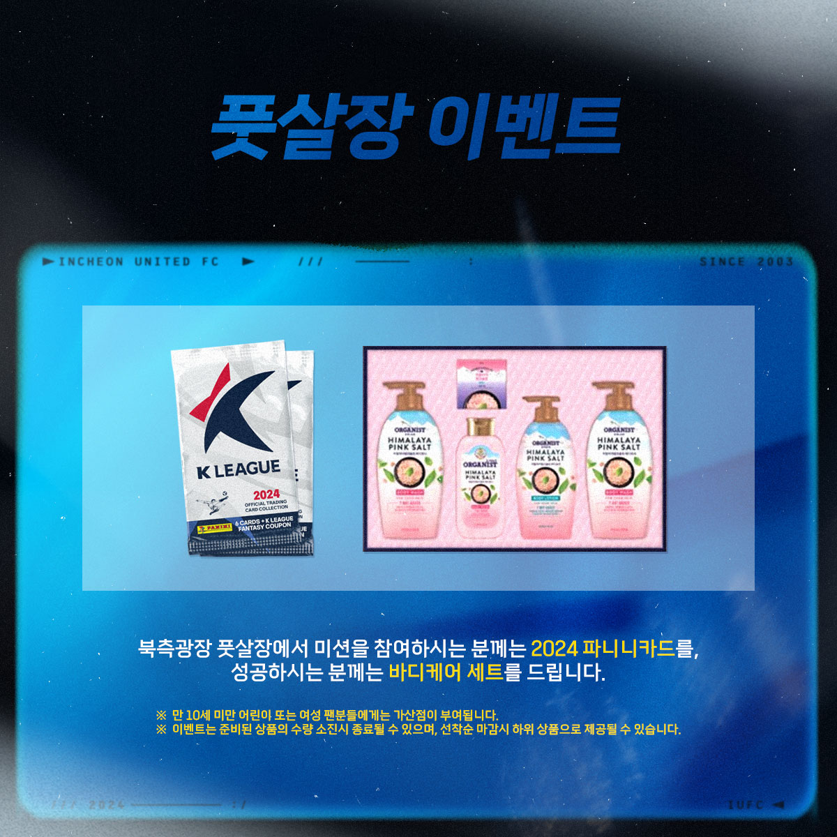 북측광장 풋살장 이벤트에서 미션을 도전하시는 모든 분들께 2024시즌 K리그 파니니 카드를, 미션에 성공하시는 분들께는 바디케어 세트를 드립니다!