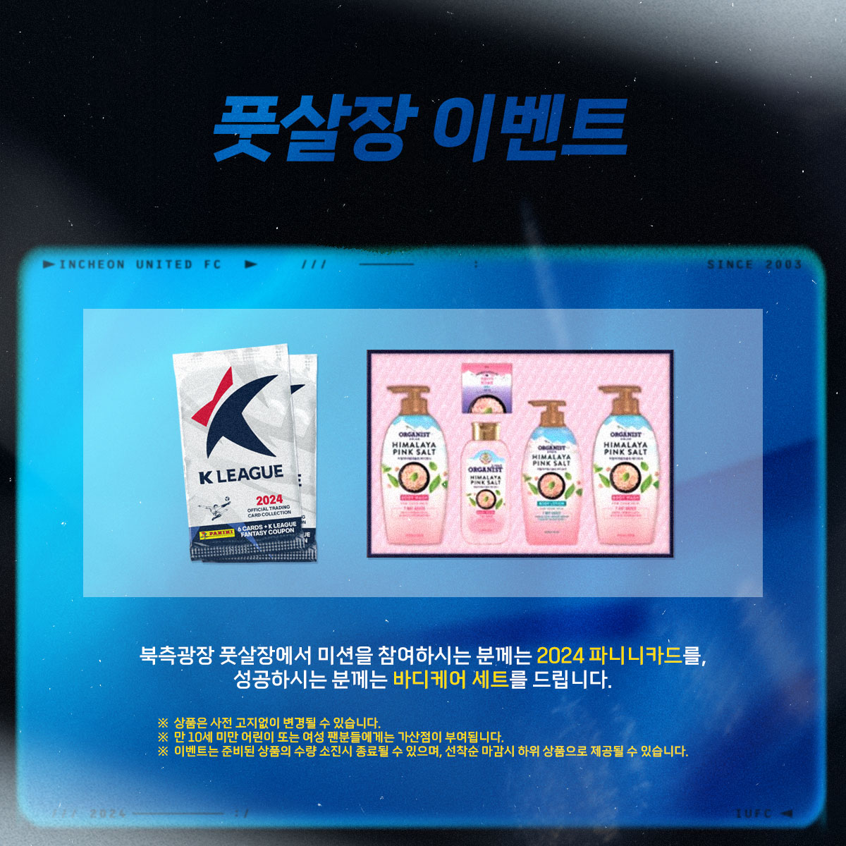 북측광장 풋살장 이벤트에서 미션을 도전하시는 모든 분들께 2024시즌 K리그 파니니 카드를, 미션에 성공하시는 분들께는 바디케어 세트를 드립니다!