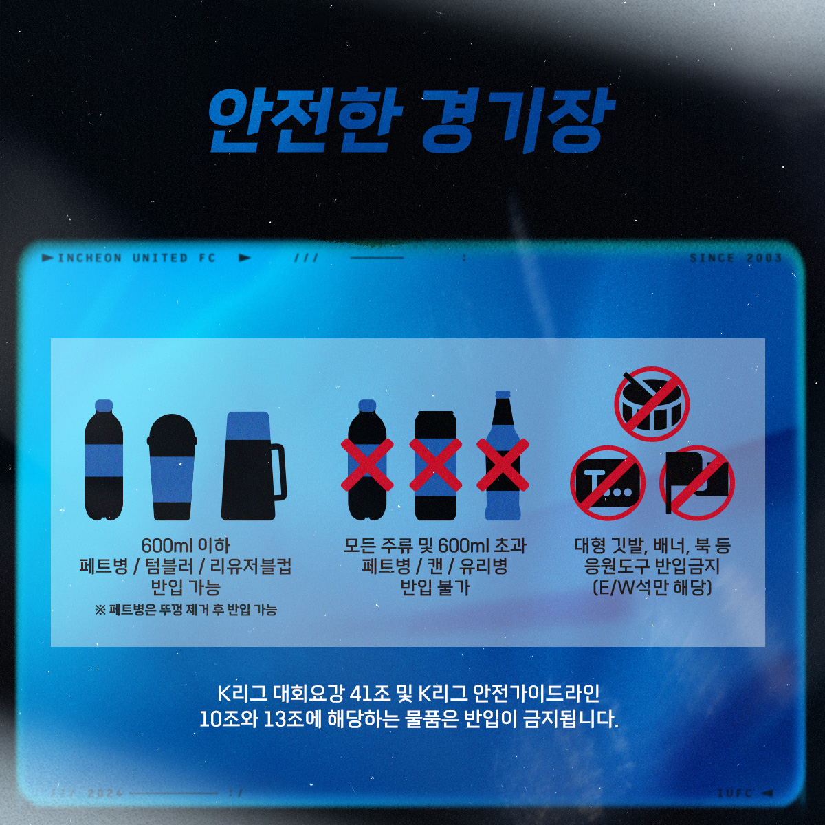 K리그 안전가이드 라인 13조에 따라 우리 구단은 홈 경기 당일 경기장 물품 반입에 대한 관리 감독을 철저하게 진행하고 있습니다. 경기장 입장 시 연맹과 구단이 정한 물품인 캔 및 유리병, 600mL를 초과하는 페트병 같은 위험 요소가 있는 물품과 기타 안전과 경기 진행에 지장을 초래할 것으로 판단되는 물품의 반입은 전면 금지됩니다.