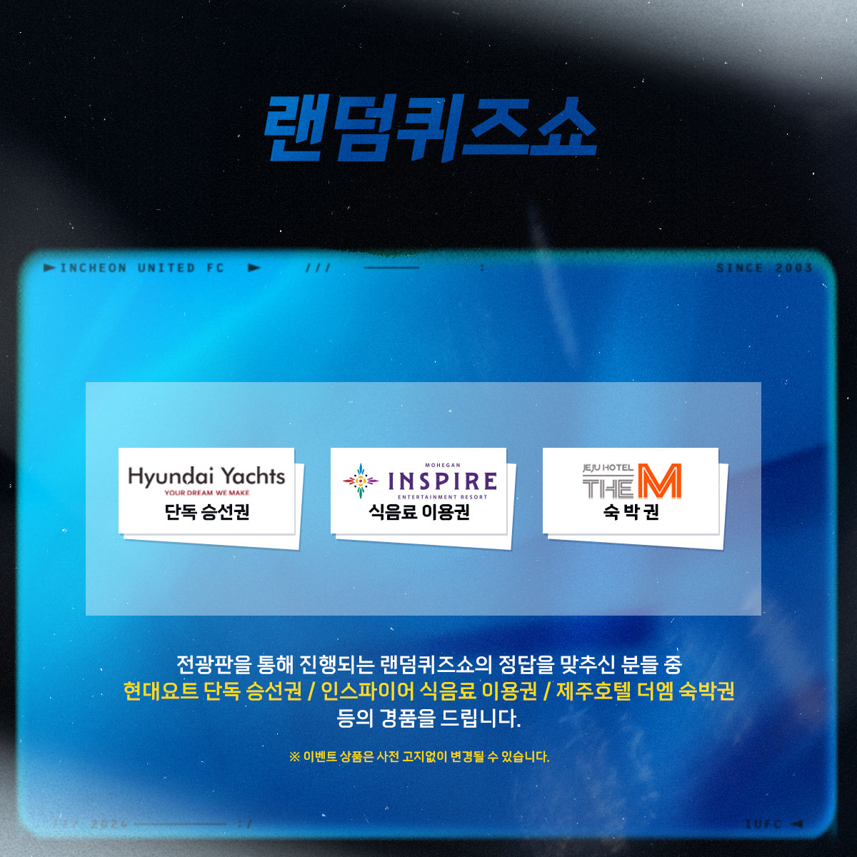 경기 전 이벤트에 참가하신 분들 중 현대요트 단독승선권, 인스파이어 리조트 식음료권, 제주호텔 더엠 숙박권 등의 다양한 구단 후원사의 경품을 드립니다!