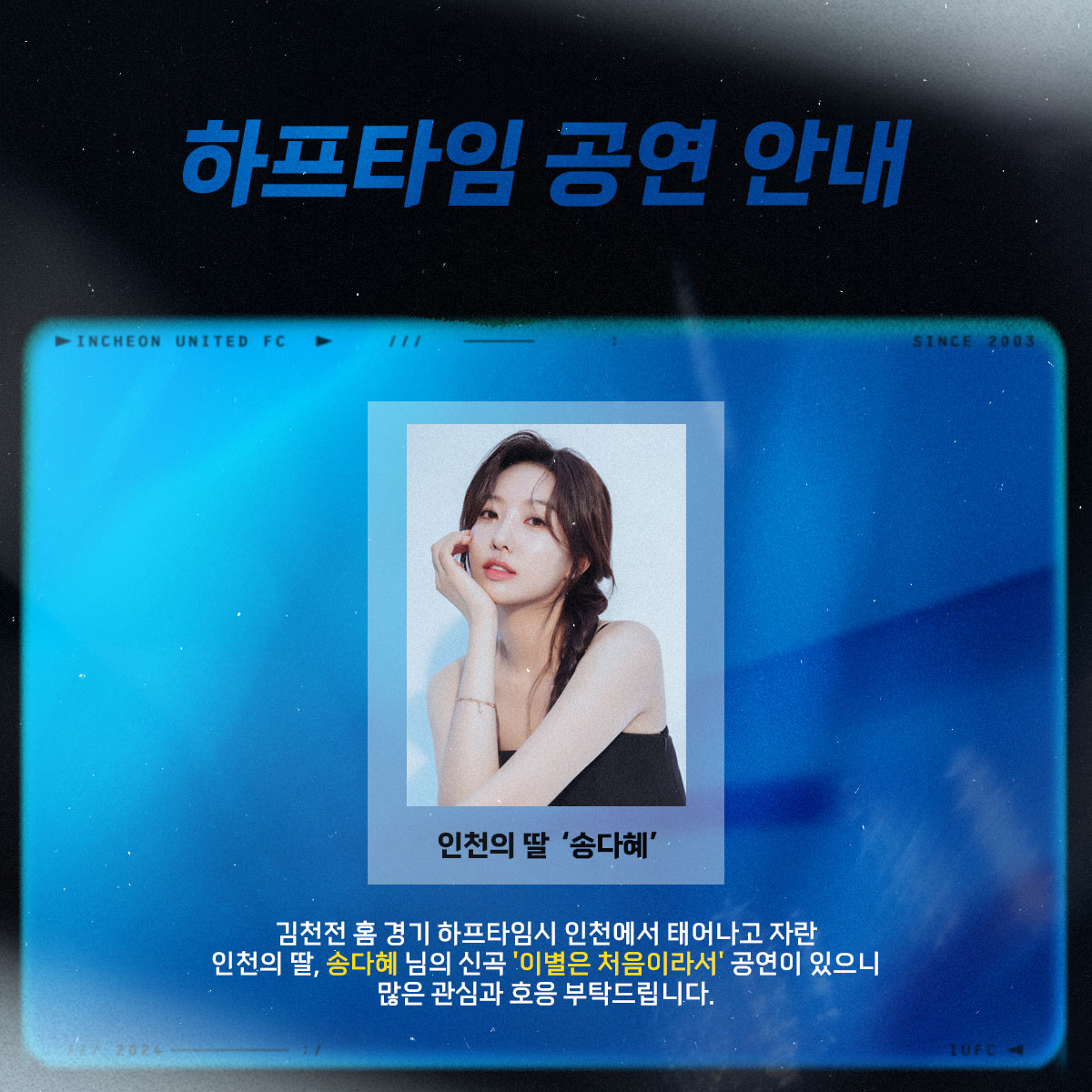 인천에서 태어나고 자란 '인천의 딸'이자 인천유나이티드의 팬! 아이돌 베스티 전 멤버 송다혜 님의 신곡 '이별은 처음이라서' 공연이 이번 홈 경기 하프타임에 진행됩니다.