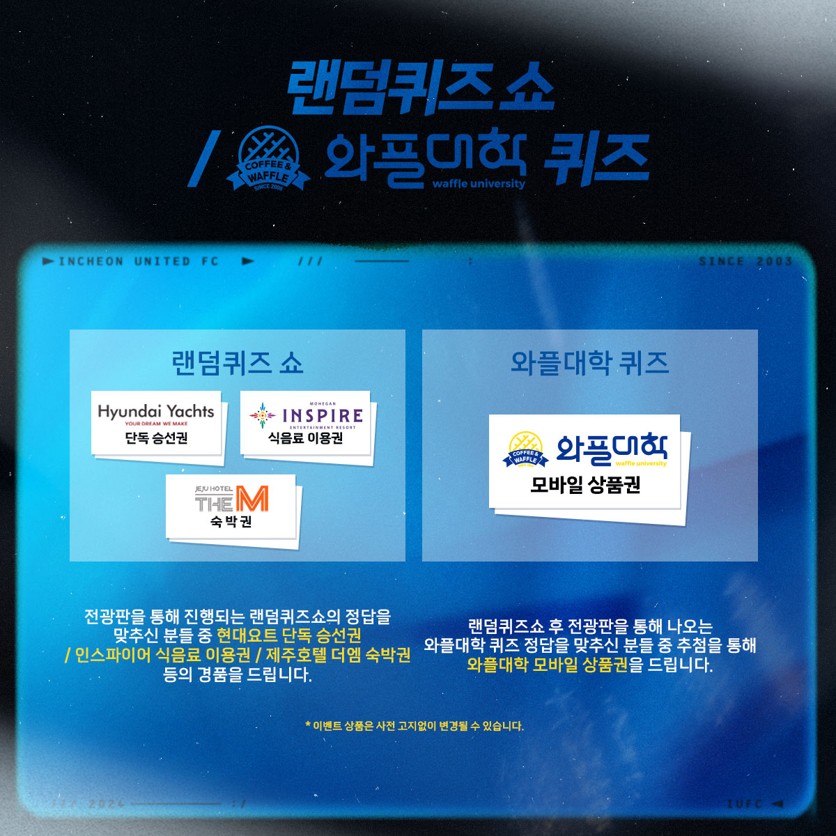 ※ 경품은 사전 고지없이 변경될 수 있습니다.※ 우천시 이벤트가 취소될 수 있습니다.※ 이벤트는 준비된 상품의 수량 소진시 종료될 수 있으며, 선착순 마감시 하위 상품으로 제공될 수 있습니다.현대요트&인스파이어&제주호텔과 함께 하는 경기 전 장내 이벤트 / 와플대학 퀴즈