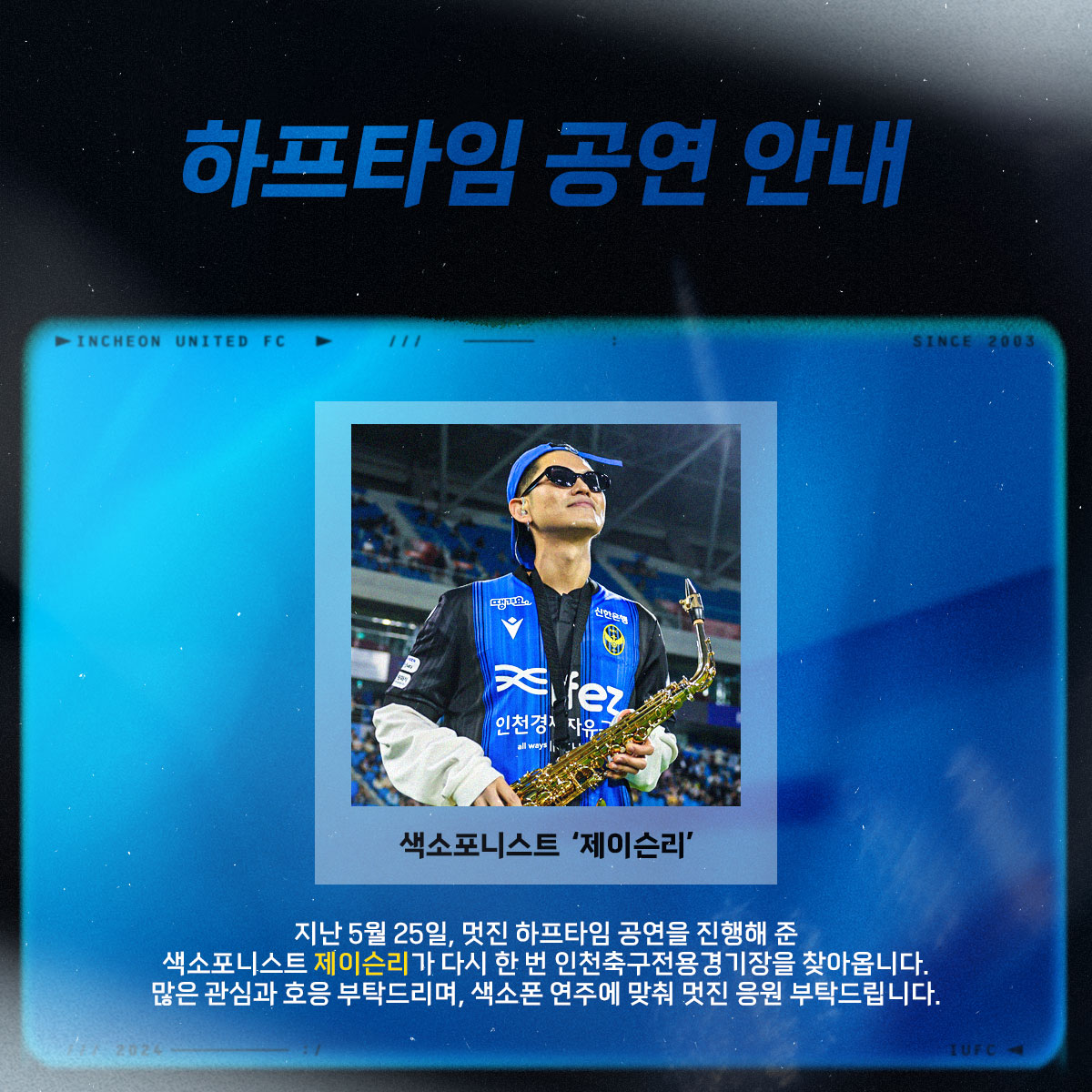지난 5월 25일 광주전에서 멋진 하프타임 공연을 펼친 색소포니스트 '제이슨리'가 다시 한 번 인천축구전용경기장을 찾아옵니다.