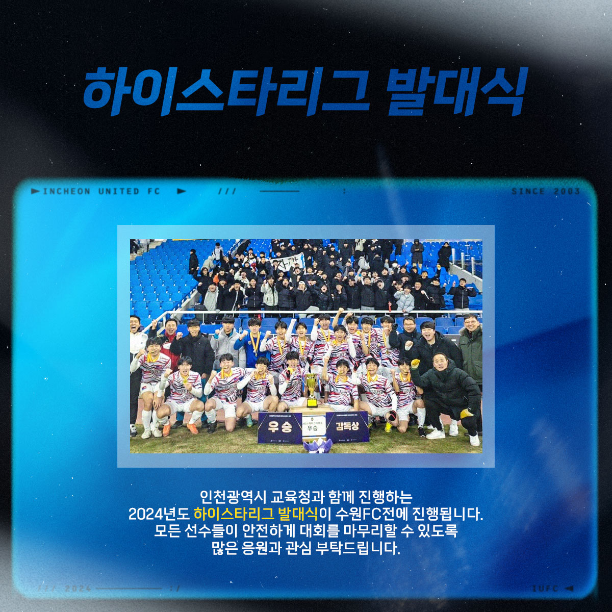 인천 지역 순수 아마추어 고등학생이 참가하는 하이스타리그 발대식이 수원FC전 홈 경기에 진행됩니다!