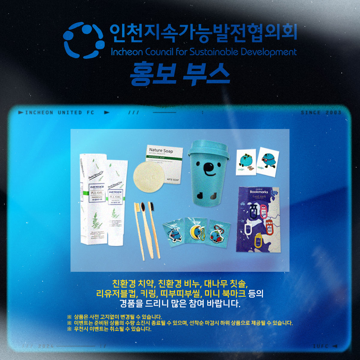 북측 광장 인천지속가능발전협의회 홍보 부스에서 친환경 치약, 친환경 비누, 대나무 칫솔, 리유저블컵, 키링, 띠부띠부씰, 미니 북마크 등 지구를 살리는 특별한 경품을 드립니다.