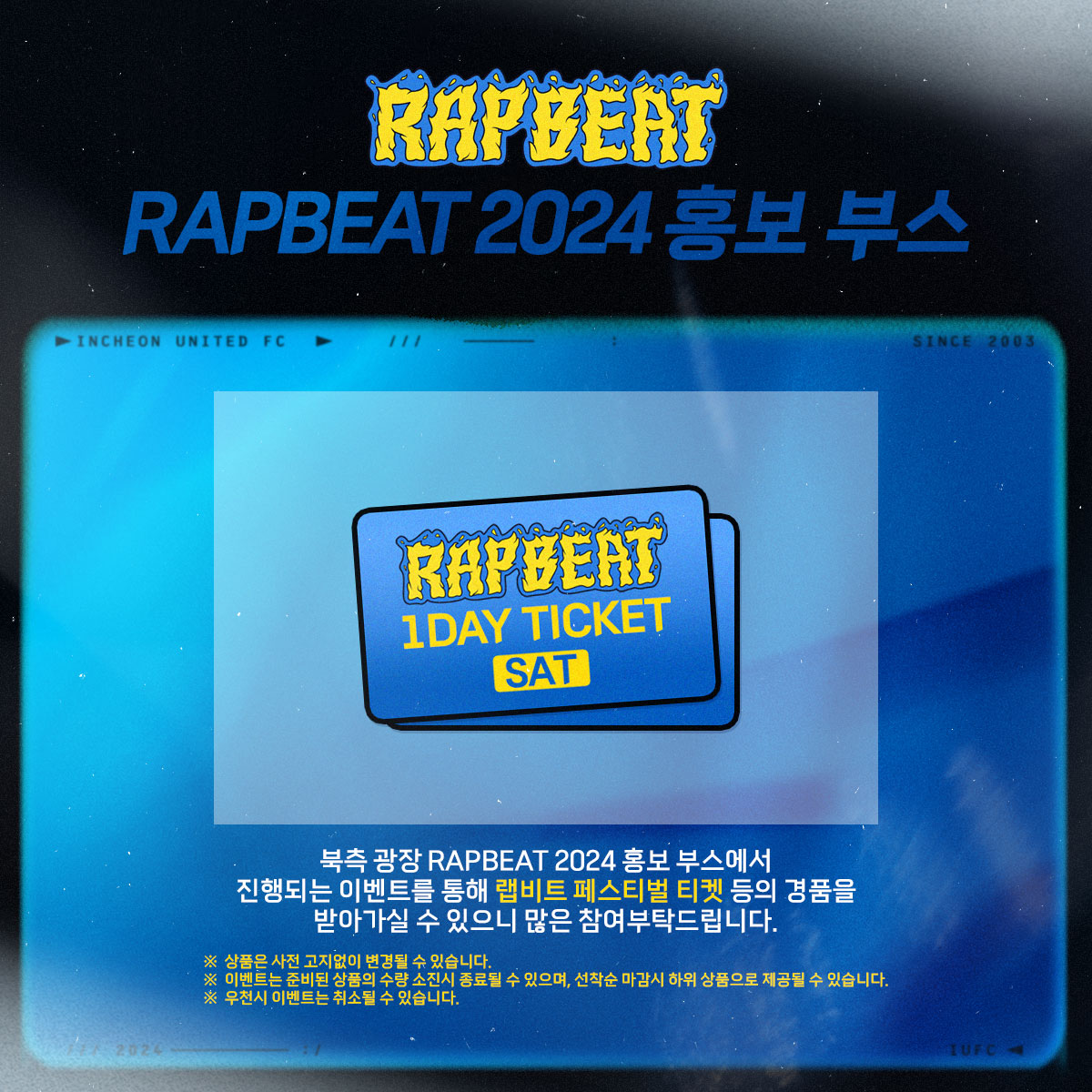 경기장 북측 광장 RAPBEAT 2024 홍보 부스에서 진행되는 이벤트를 통해 페스티벌 티켓, 커피 기프티콘 등의 경품을 받아가실 수 있습니다. 팬 여러분의 많은 참여 부탁드립니다!