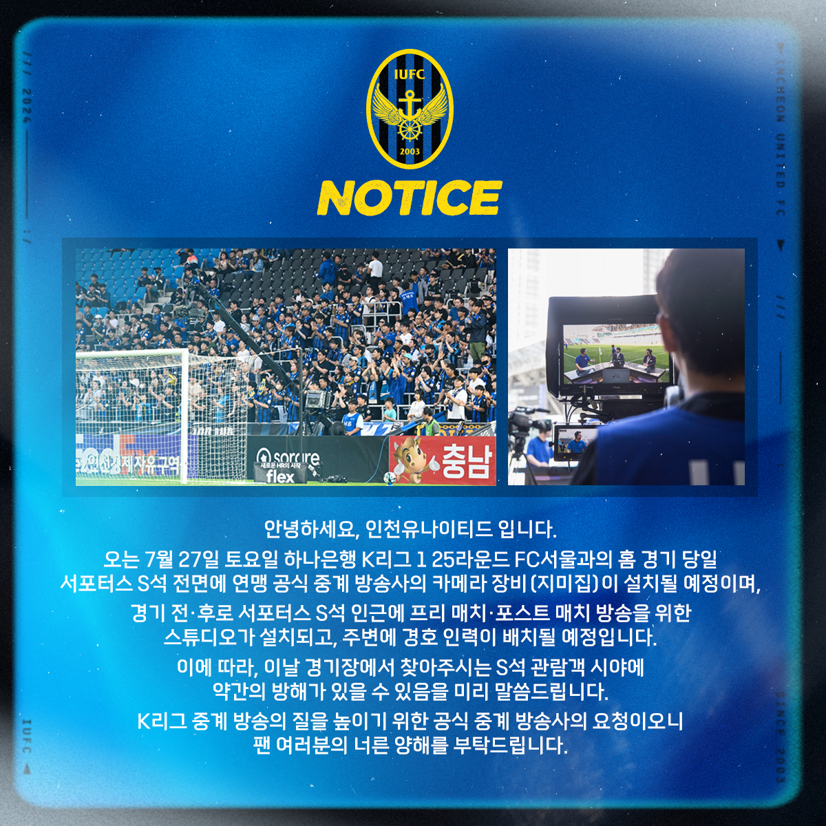 오는 7월 27일 토요일 하나은행 K리그 1 25라운드 FC서울과의 홈 경기 당일 서포터스 S석 전면에 연맹 공식 중계 방송사의 카메라 장비(지미집)이 설치될 예정이며,