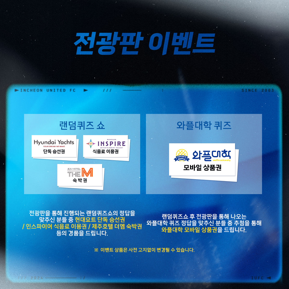 경기 전 전광판 이벤트에 참가하신 분들 중 현대요트 단독승선권, 인스파이어 리조트 식음료권, 제주호텔 더엠 숙박권, 와플대학 모바일 상품권 등의 다양한 구단 후원사의 경품을 드립니다.