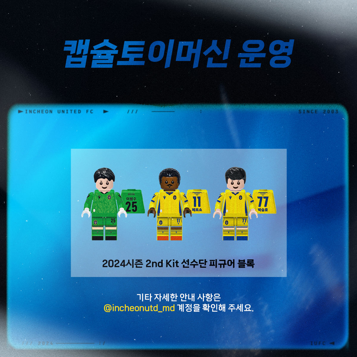 홈 경기 캡슐토이머신 가격 및 기타사항은 추후 구단 공식 MD 인스타그램 계정(@incheonutd_md)에서 공개될 예정이니 많은 관심 부탁드립니다!
