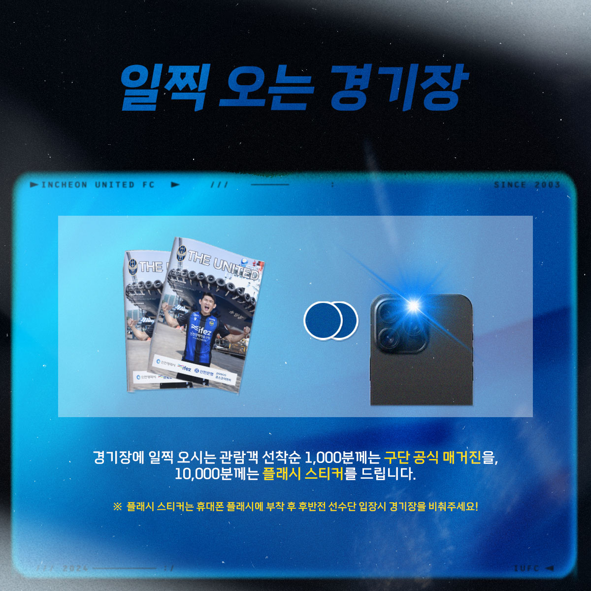 경기장에 일찍 오시는 관람객 선착순 1,000분께는 구단 공식 매거진을, 선착순 10,000분께는 휴대폰 플래시 스티커를 드립니다!