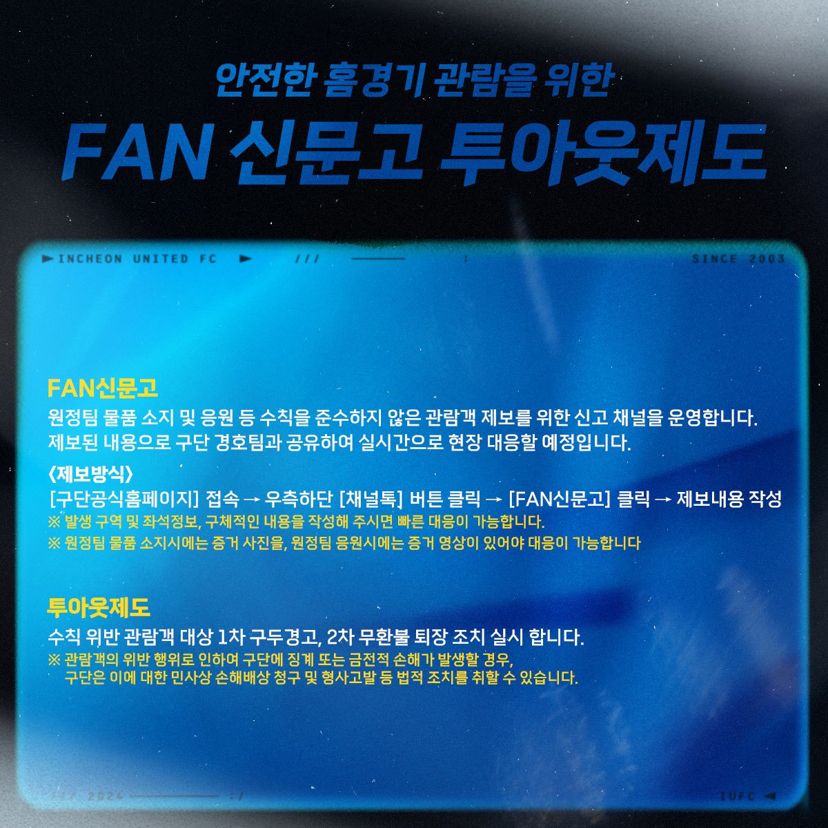 인천 홈 경기에는 ‘FAN 신문고, 투아웃제도’를 도입해 관람객 제보를 위한 신고 채널을 운영합니다. 제보된 내용은 구단 경호 팀과 공유되며 실시간으로 현장 대응할 예정입니다. 위반한 관람객은 1차 구두 경고, 2차 무환불 퇴장 등 강력한 조치를 할 예정이오니 팬 여러분의 관람 수칙 준수를 부탁드립니다.