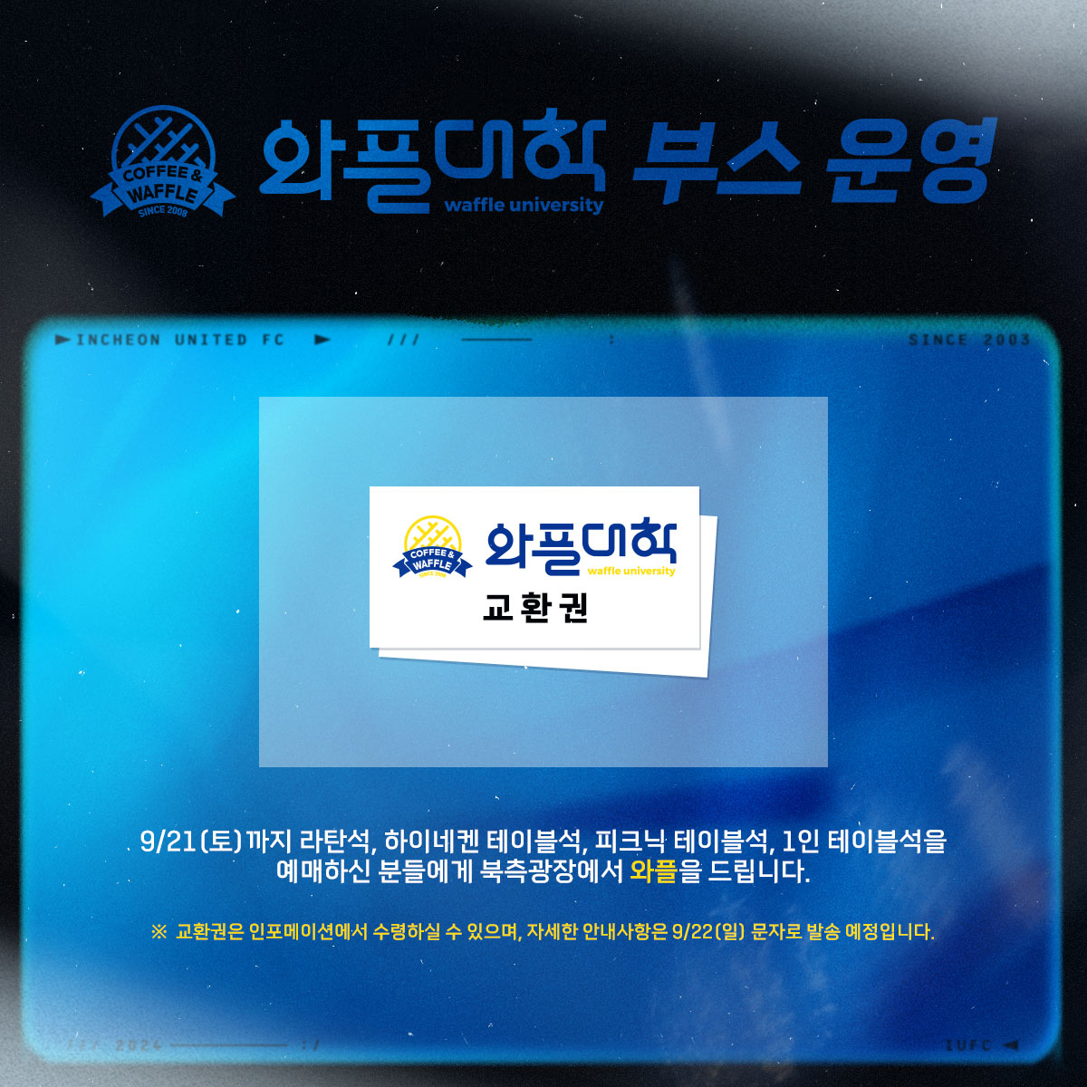 ※ 경기 시간(19:00~20:45)에는 매장 재정비를 위해 운영되지 않습니다. 단, 하프타임 시간에는 운영됩니다.▶ 티켓구매 : https://iufc.kr/ti▶ 유선문의 : 032-880-5524