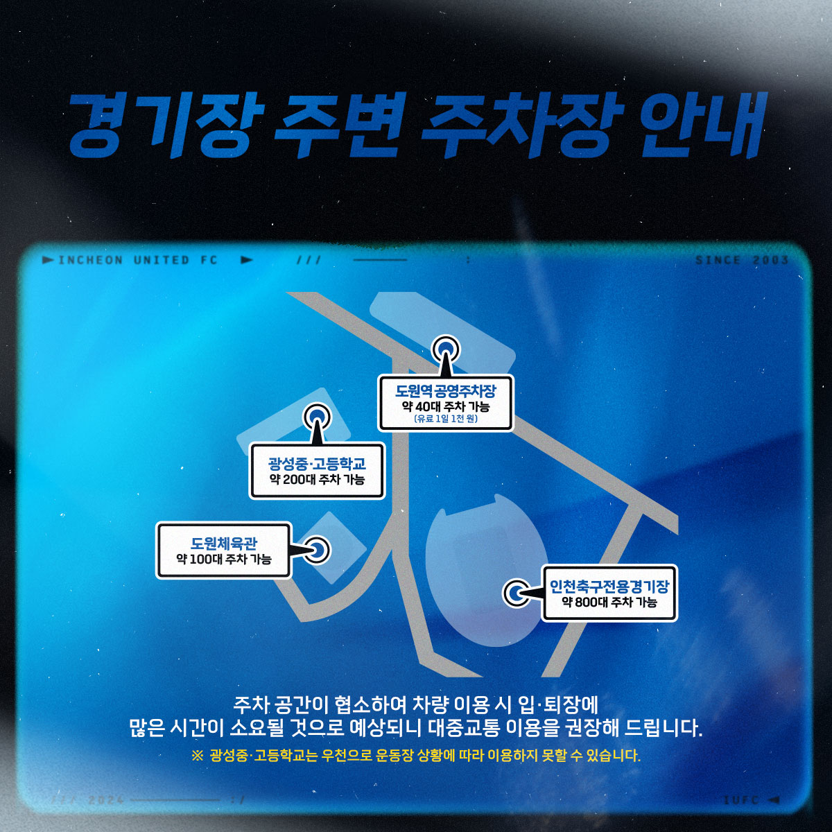 당일 경기장 및 인근 주차장이 협소하며, 홈 경기 당일 차량 이용시 입장과 퇴장에 많은 시간이 소요될 것으로 예상되니 가급적 대중교통 이용을 권장드립니다.