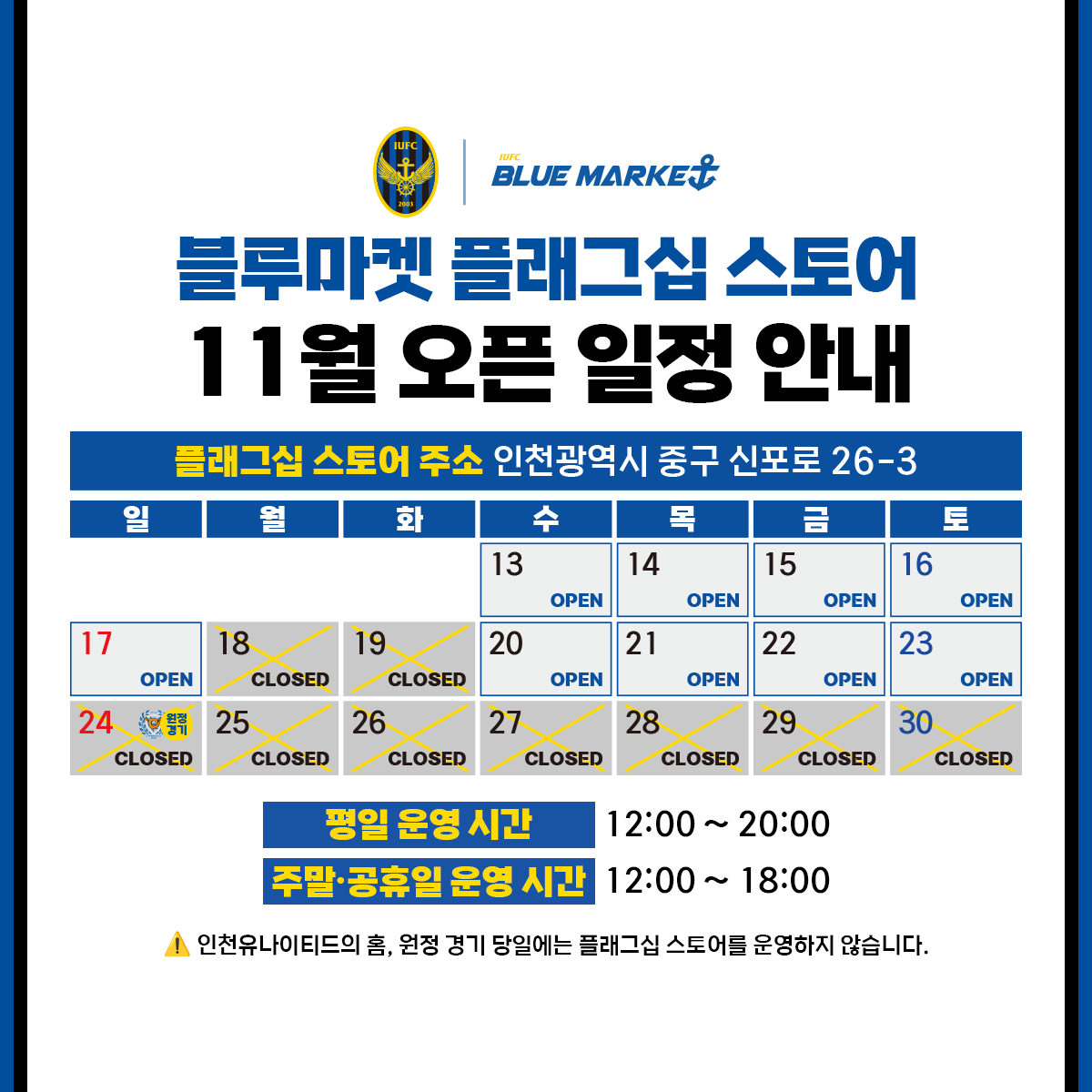 인천유나이티드의 홈, 원정 경기 당일에는 플래그십 스토어를 운영하지 않습니다.