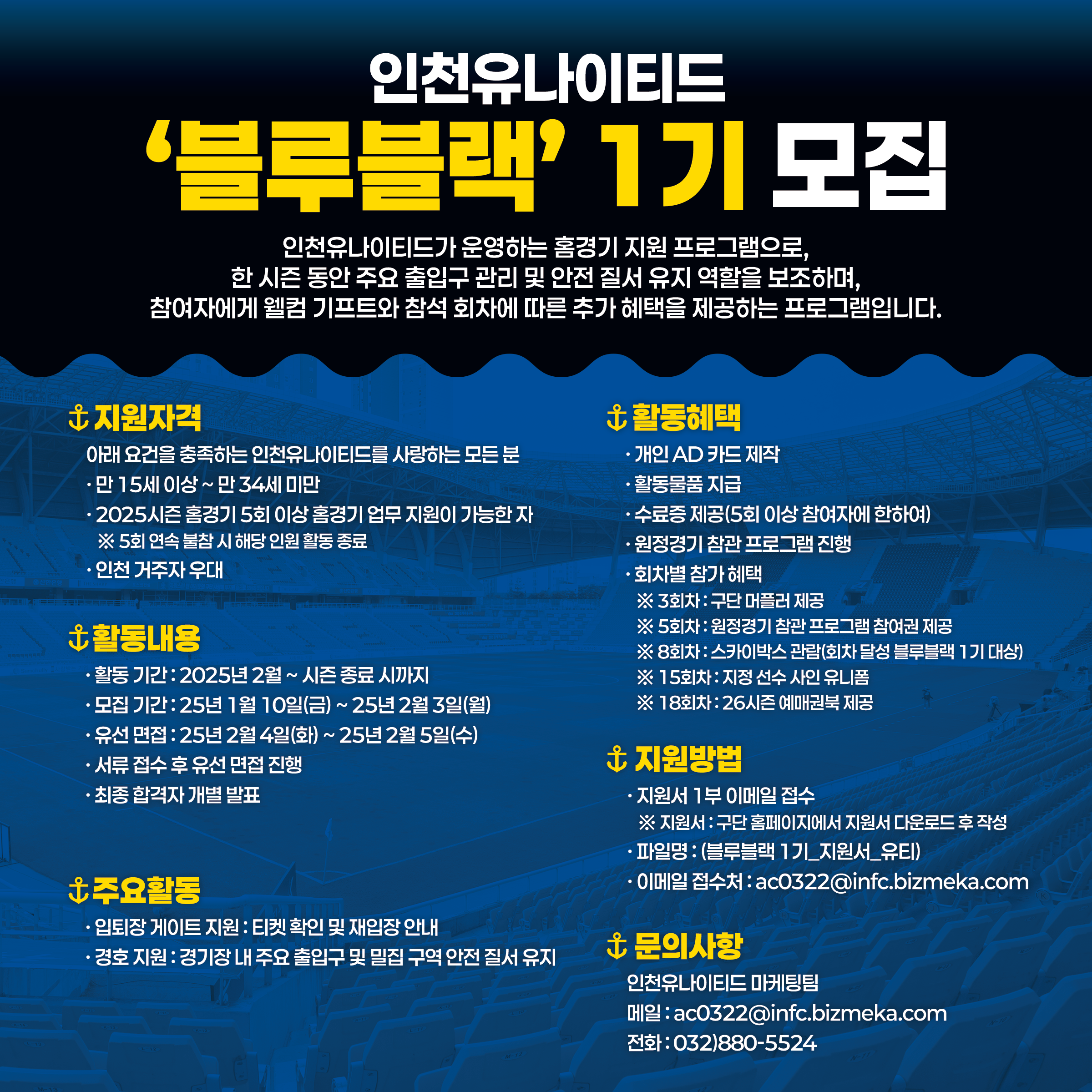 안전하고 원활한 2025시즌 인천유나이티드의 홈경기를 만들어 갈 '블루블랙' 1기를 모집합니다!