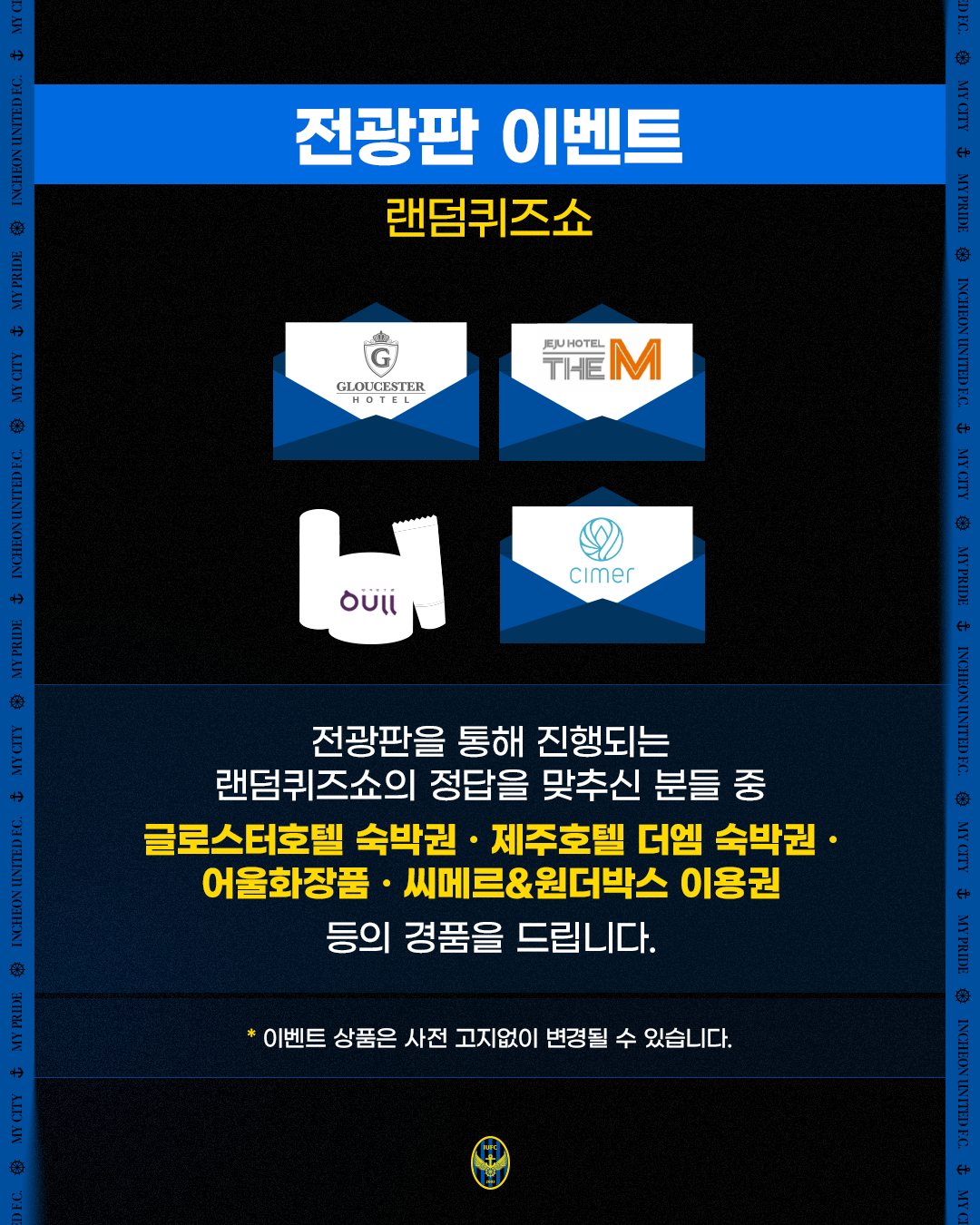 경기 전 전광판 이벤트에 참가하신 분들 중 글로스터호텔 숙박권, 제주호텔 더엠 숙박권, 어울화장품, 씨메르&원더박스 이용권 등의 다양한 구단 후원사의 경품을 드립니다.
