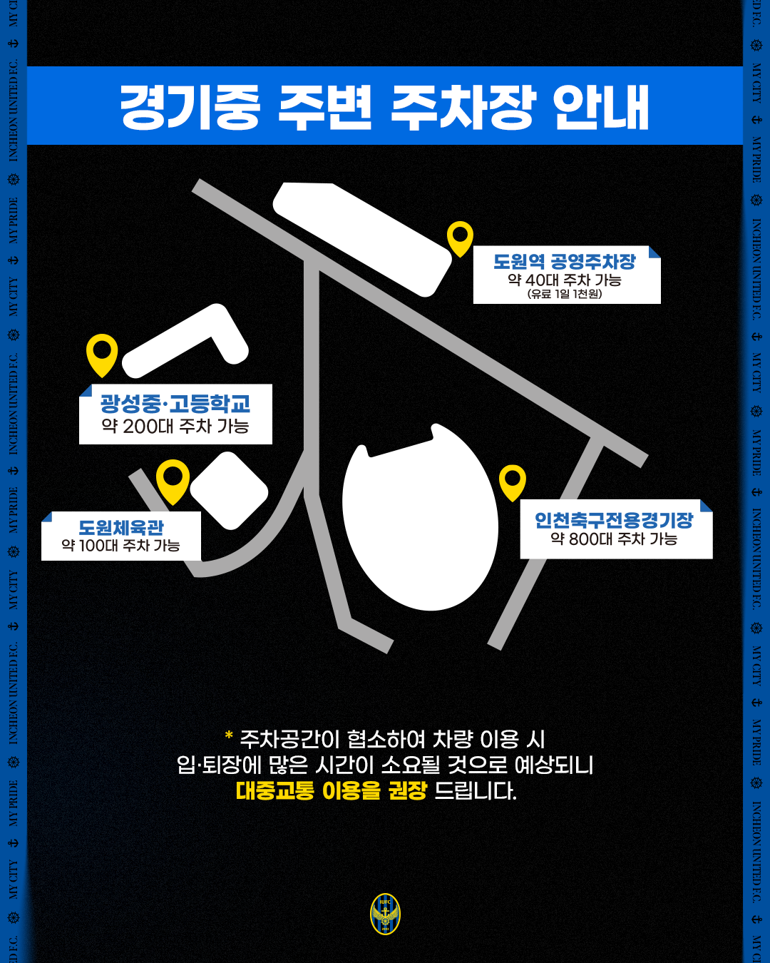 ※ 홈 경기 당일 관람객이 몰리고 주차 구역이 협소하여 현장 주차가 힘들 것으로 예상됨에 따라 대중교통을 이용해주시기 바랍니다.