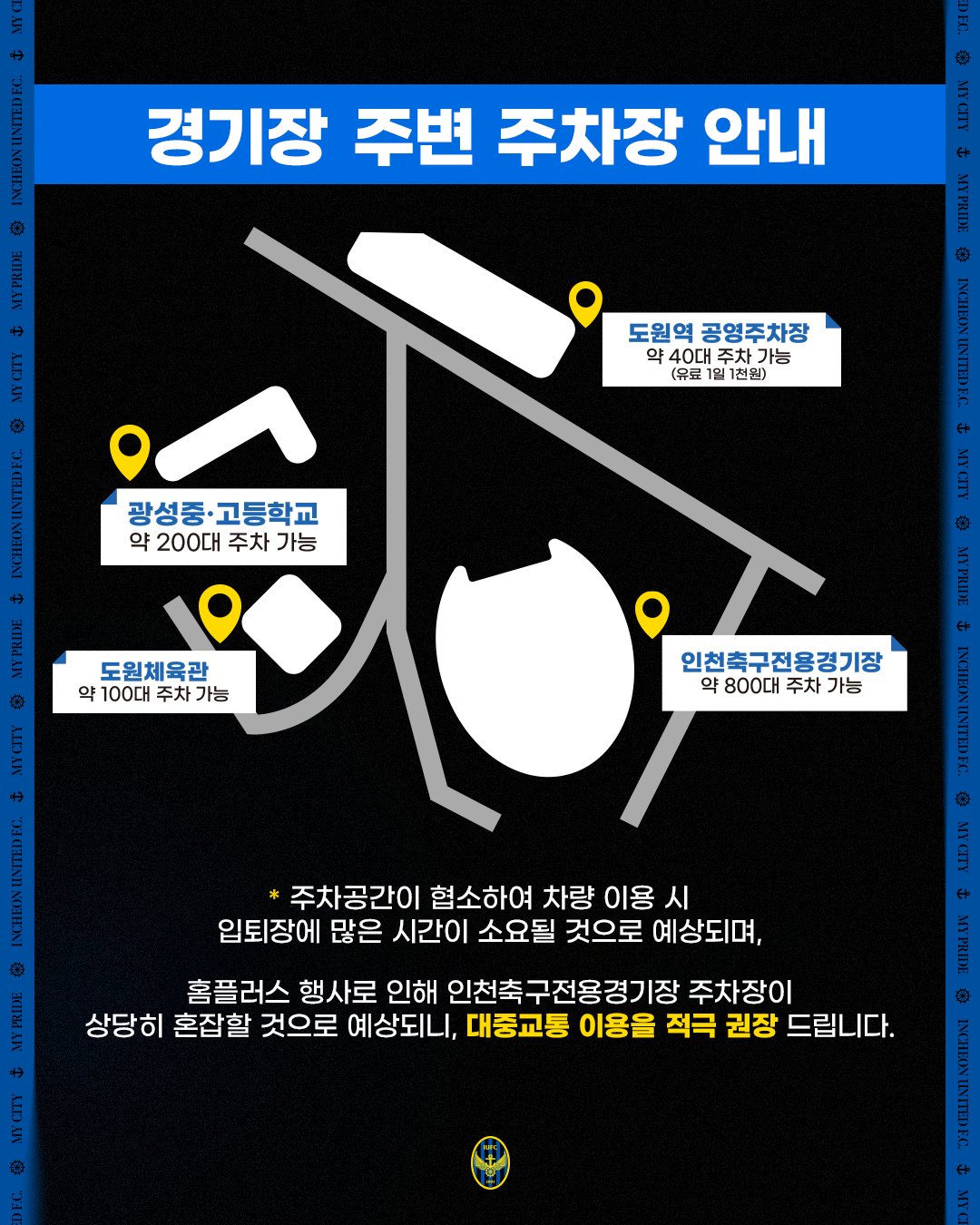 ※ 홈 경기 당일 관람객이 몰리고 주차 구역이 협소하여 현장 주차가 힘들 것으로 예상됨에 따라 대중교통을 이용해주시기 바랍니다.
