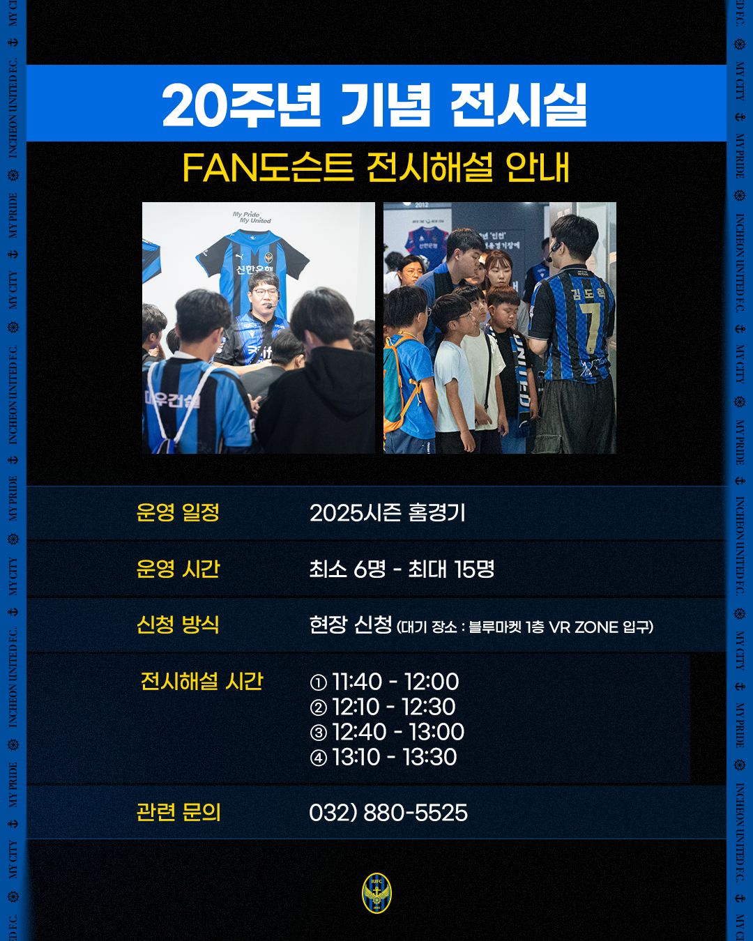 - 20주년 기념 전시실 FAN 도슨트 전시해설※ 홈 경기 당일 관람객이 몰리고 주차 구역이 협소하여 현장 주차가 힘들 것으로 예상됨에 따라 대중교통을 이용해주시기 바랍니다.