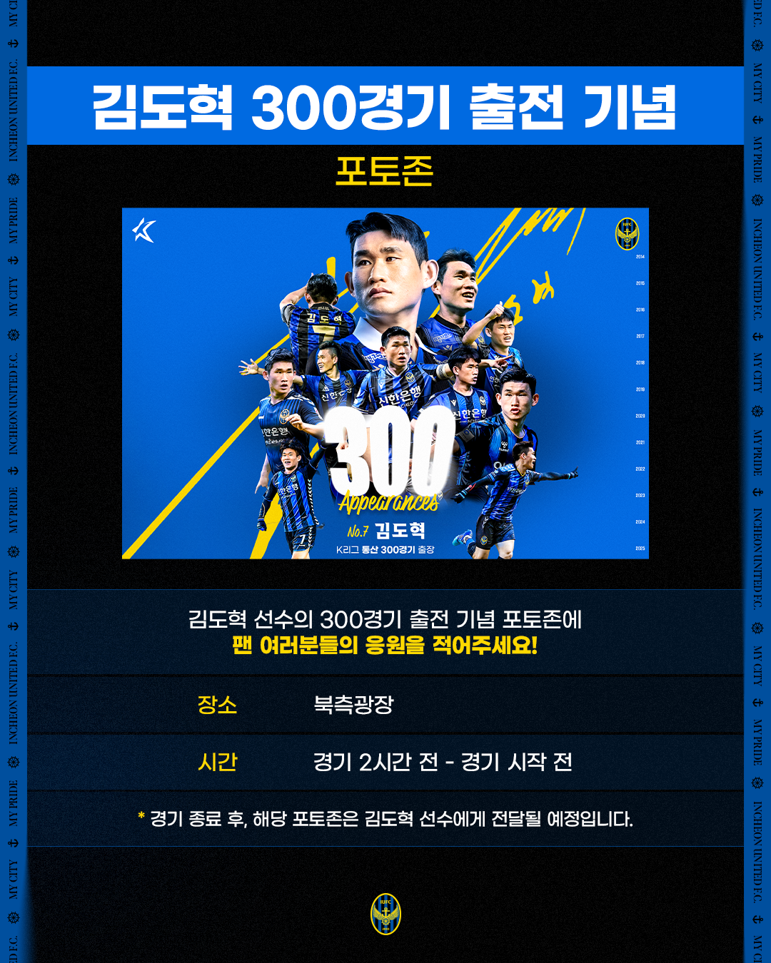 ▶ 티켓구매 : https://iufc.kr/ti▶ 유선문의 : 032-880-5526김도혁 선수 300경기 출전 기념 포토존 및 이벤트