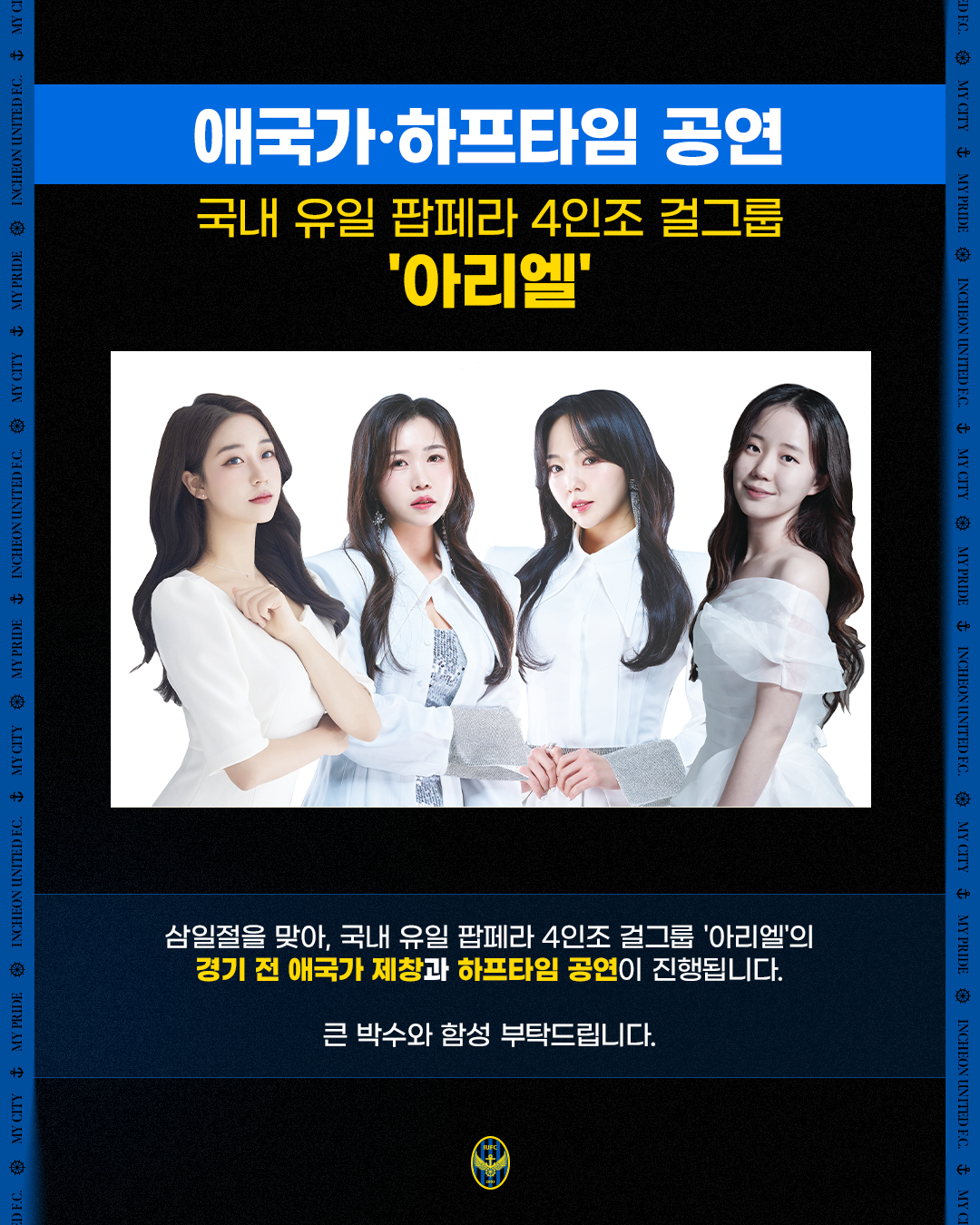 국내 유일 팝페라 4인조 걸그룹 아리엘의 애국가 제창 및 하프타임 공연이 진행됩니다.