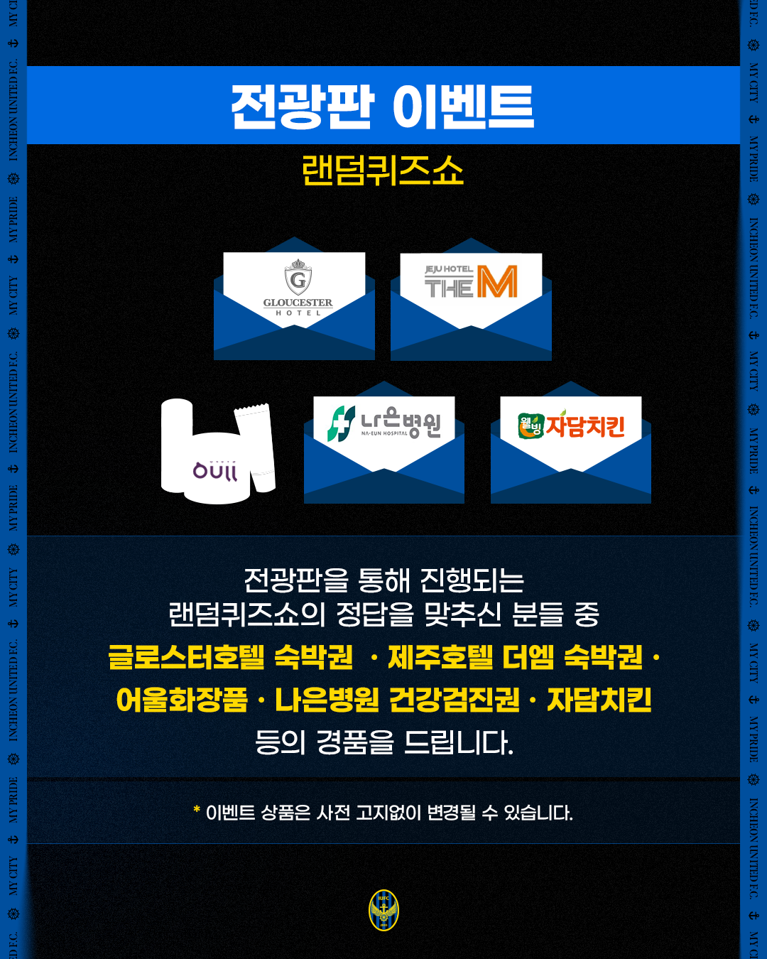 경기 전 전광판 이벤트에 참가하신 분들 중 글로스터호텔 숙박권, 제주호텔 더엠 숙박권, 어울화장품, 나은병원 건강검진권, 자담치킨 상품권 등의 다양한 구단 후원사의 경품을 드립니다.