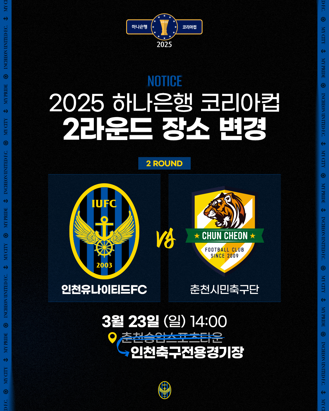 춘천시민축구단 사정으로 코리아컵 2라운드 경기장소가 '춘천송암스포츠타운' 에서 '인천축구전용경기장' 으로 변경되었습니다.