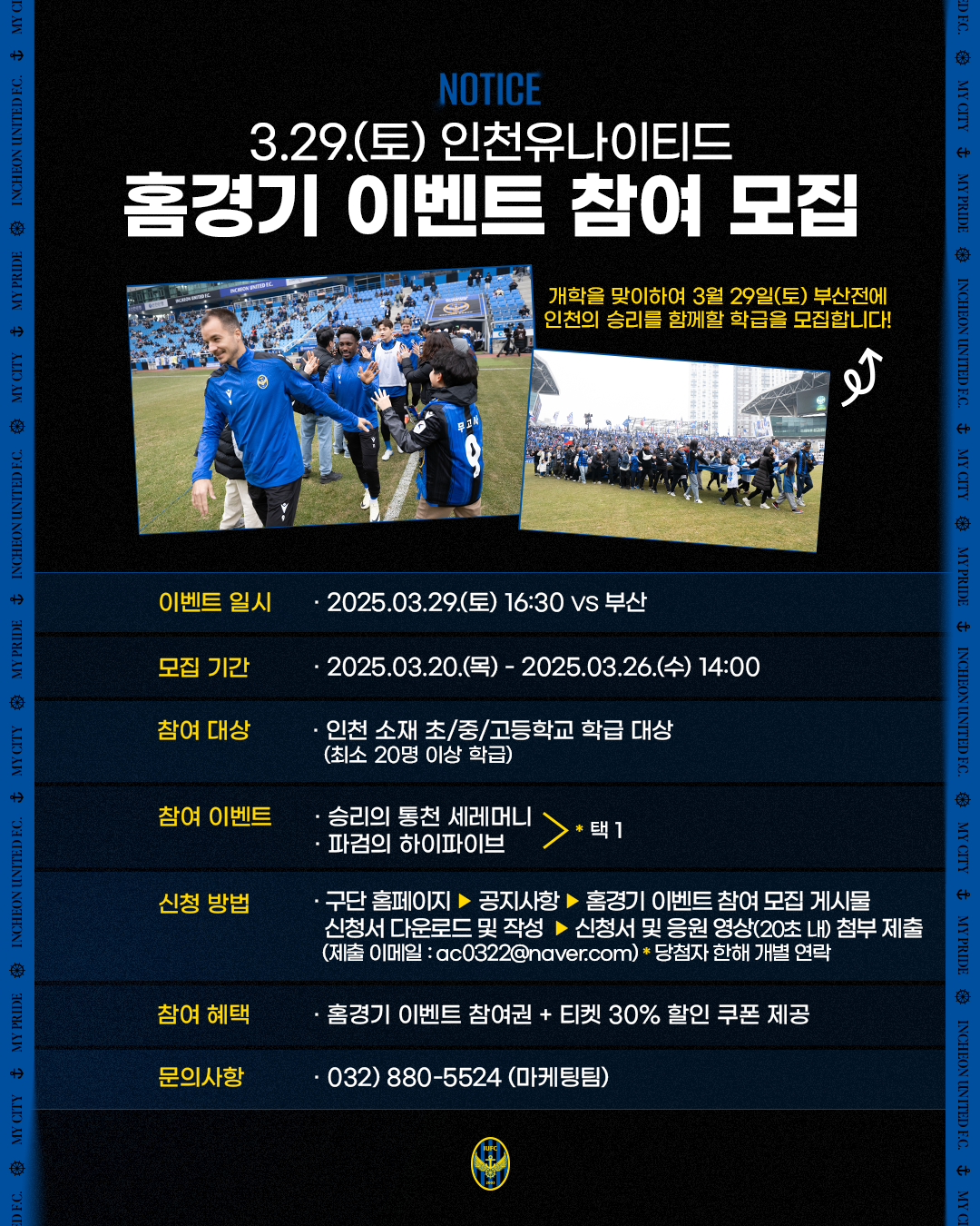 3월 29일(토) 부산전에서 인천의 승리를 함께할 학급을 모집하오니 많은 참여 바랍니다.