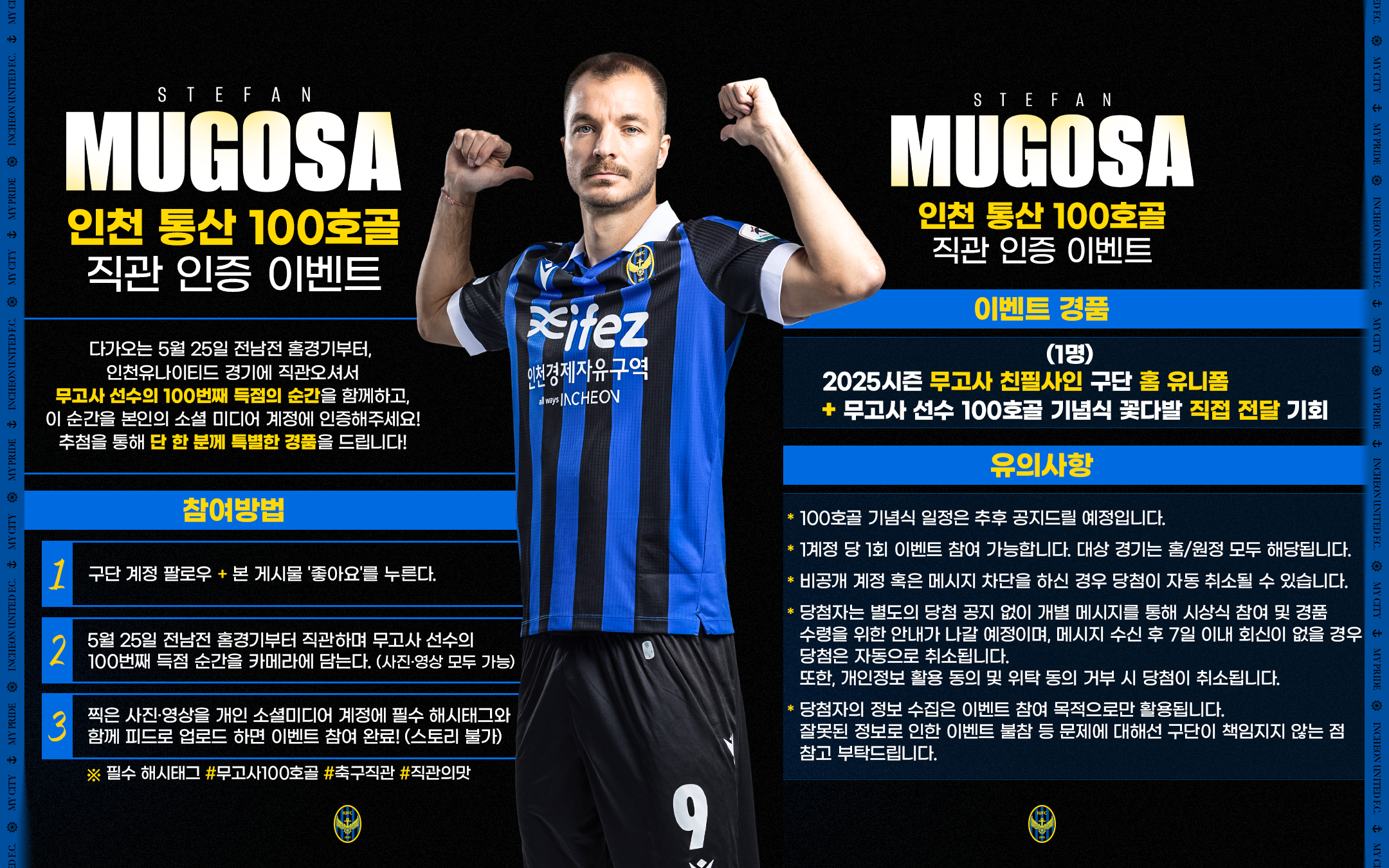 다가오는 5월 25일 전남전 홈경기부터 경기장에 직관오셔서 무고사 선수의 100번째 득점의 순간을 함께하고, 이 순간을 본인의 소셜미디어 계정에 인증해주세요.