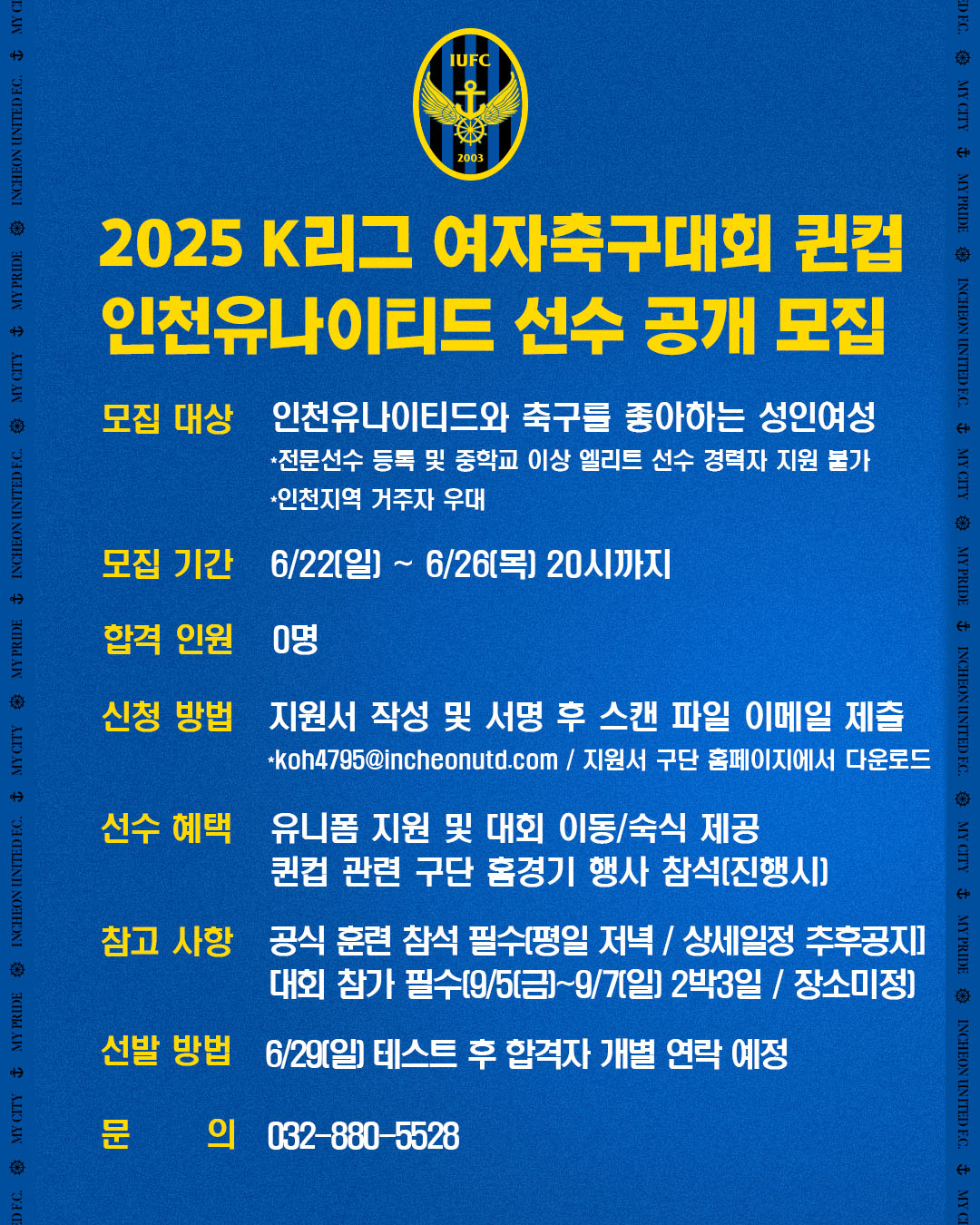인천유나이티드에서 [2025 K리그 여자축구대회 퀸컵]에 출전할 구단 대표 선수를 공개 모집합니다.