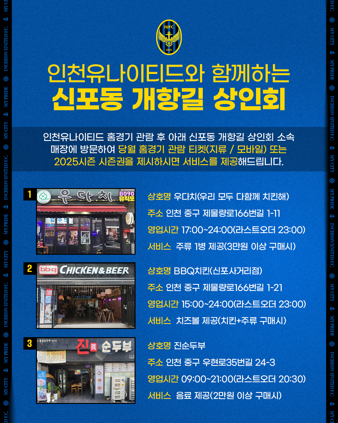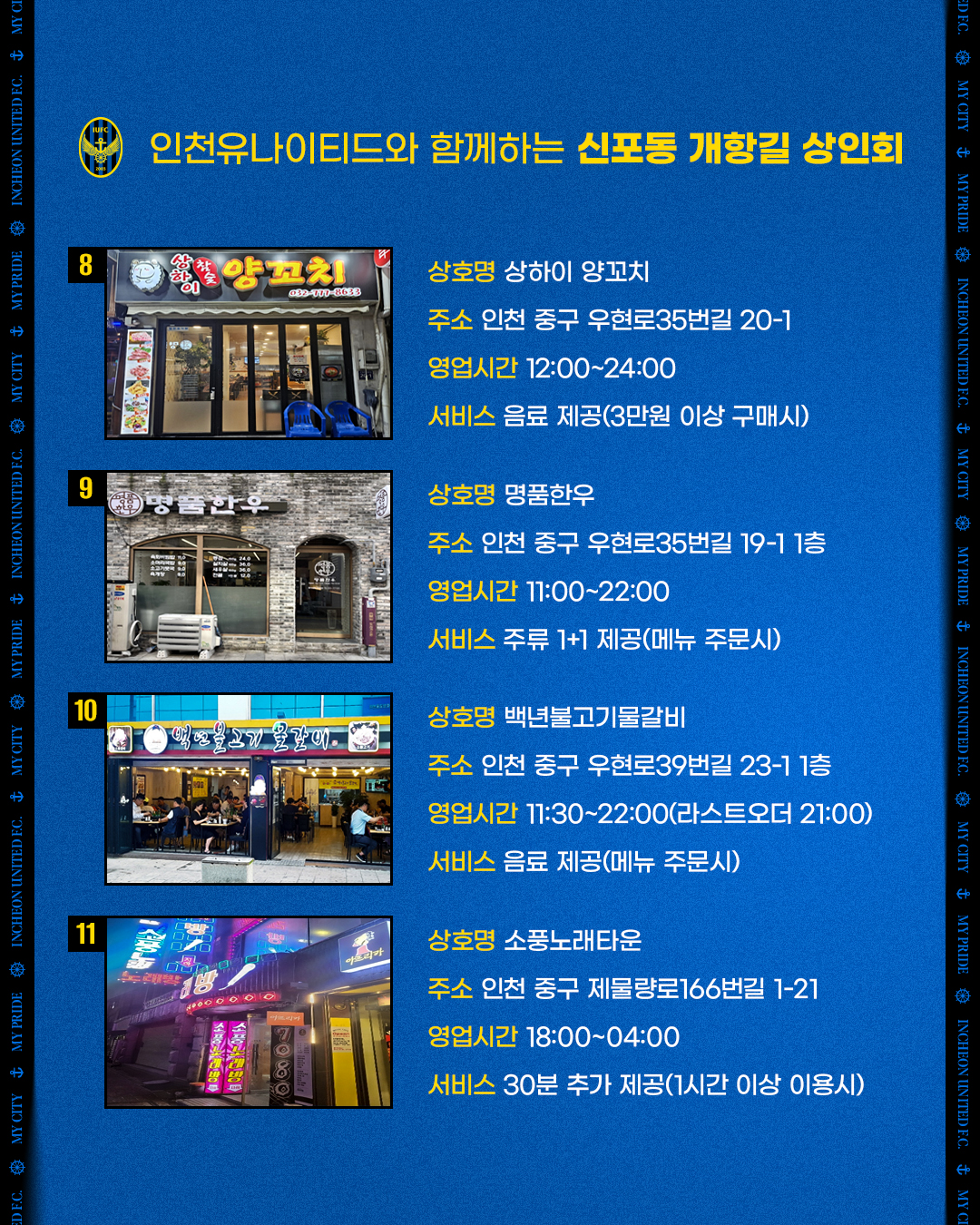 신포동 개항길 상인회 협력 매장에 방문하시면 관람 홈경기 당월에 한하여 해당되는 서비스를 제공해드립니다!인천유나이티드와 함께하는 개항길 신포동 상인회 협력 매장 안내