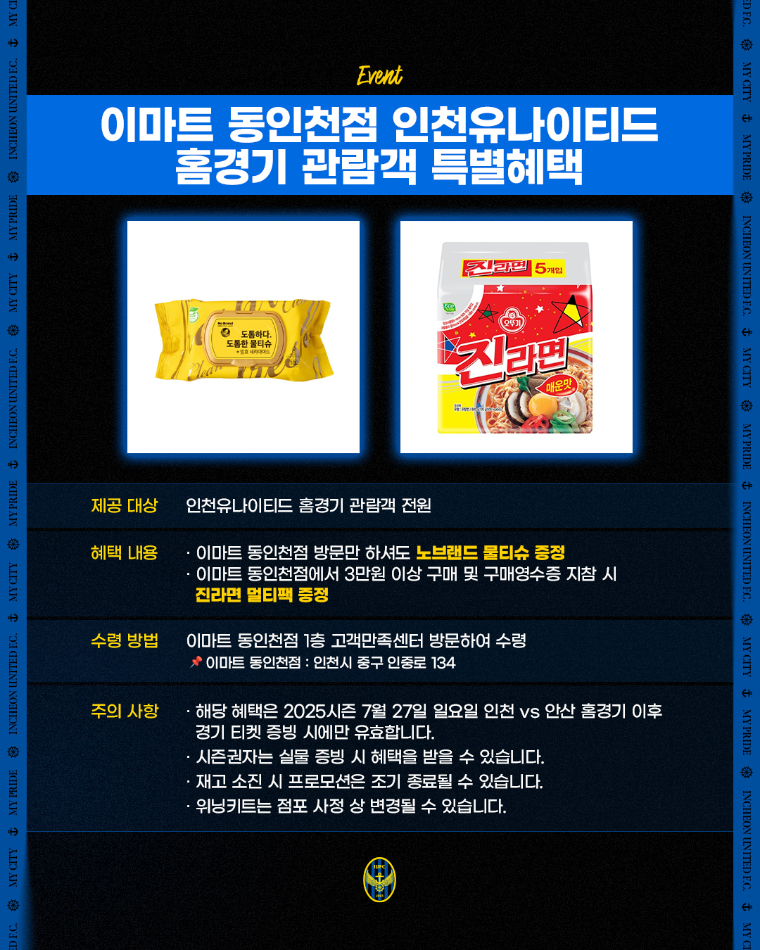 ※ 인천유나이티드 X 이마트 동인천점 [위닝 이벤트]와 [홈경기 관람객 특별혜택]은 중복 혜택 적용 가능합니다.