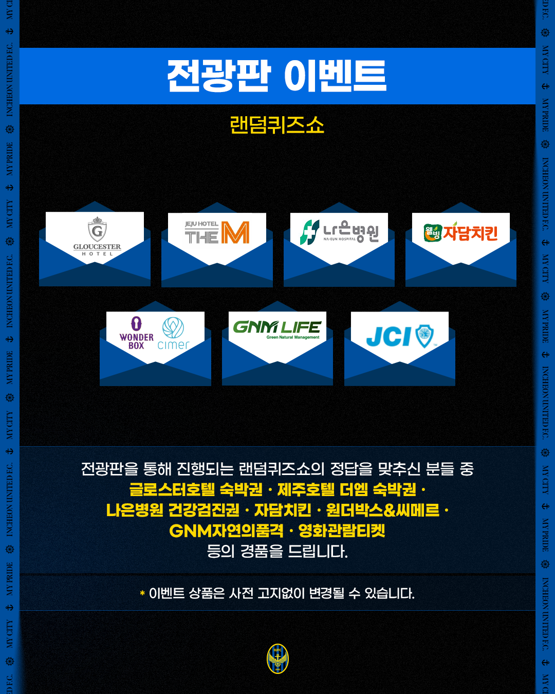 - 글로스터호텔, 제주호텔더엠, 나은병원, 자담치킨, 원더박스&씨메르, GNM자연의품격과 함께 하는 경기 전 전광판 이벤트