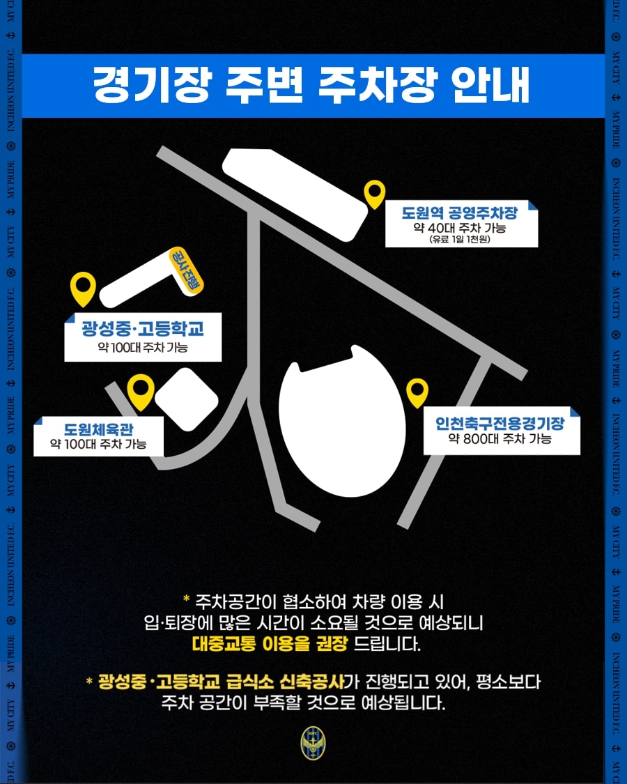 ※ 홈 경기 당일 관람객이 몰리고 주차 구역이 협소하여 현장 주차가 힘들 것으로 예상됨에 따라 대중교통을 이용해주시기 바랍니다.