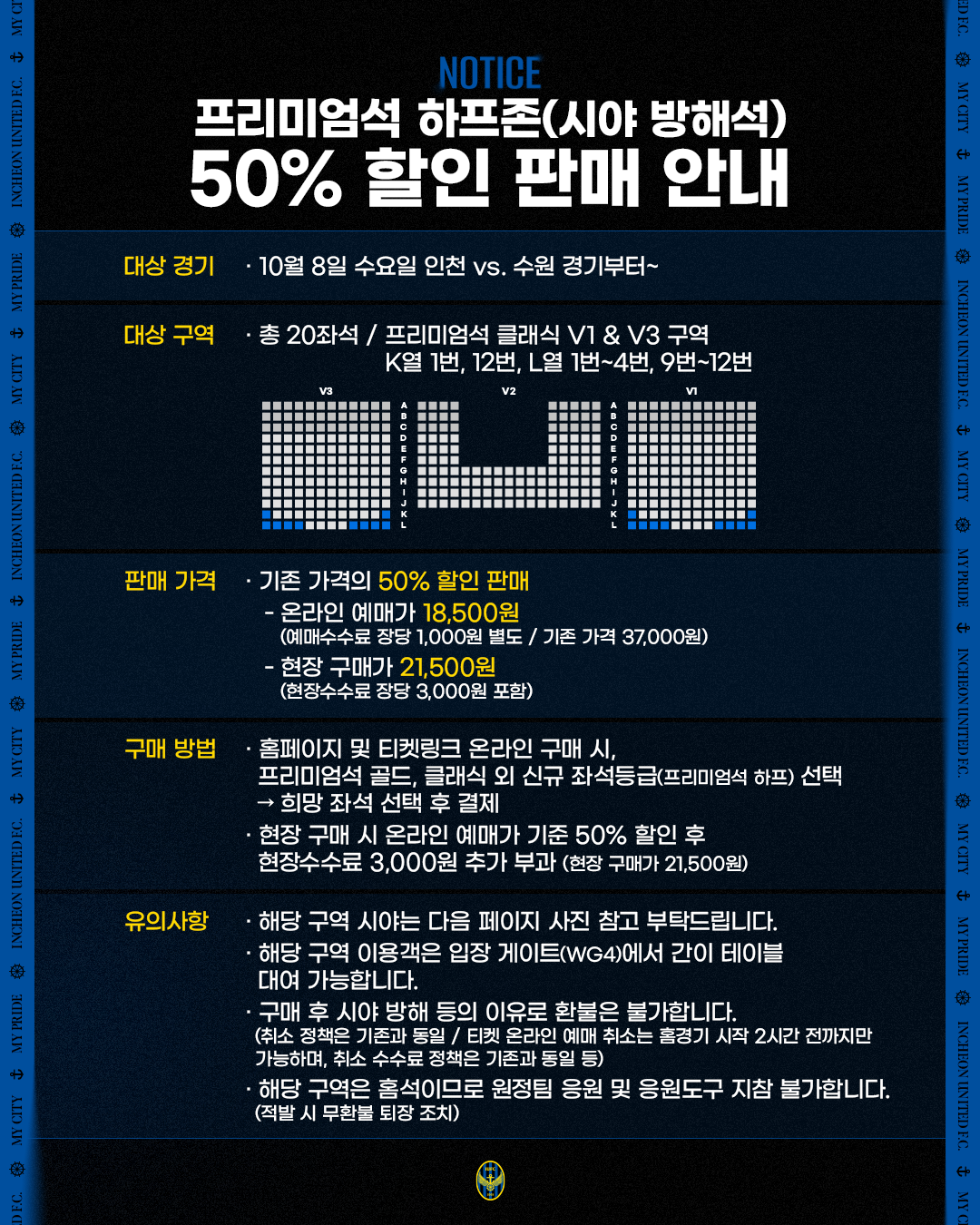 매진 등으로 프리미엄석 클래식 예매를 하지 못하는 관람객을 위해 기존 시야 방해석을 반값(50%) 할인 판매합니다.