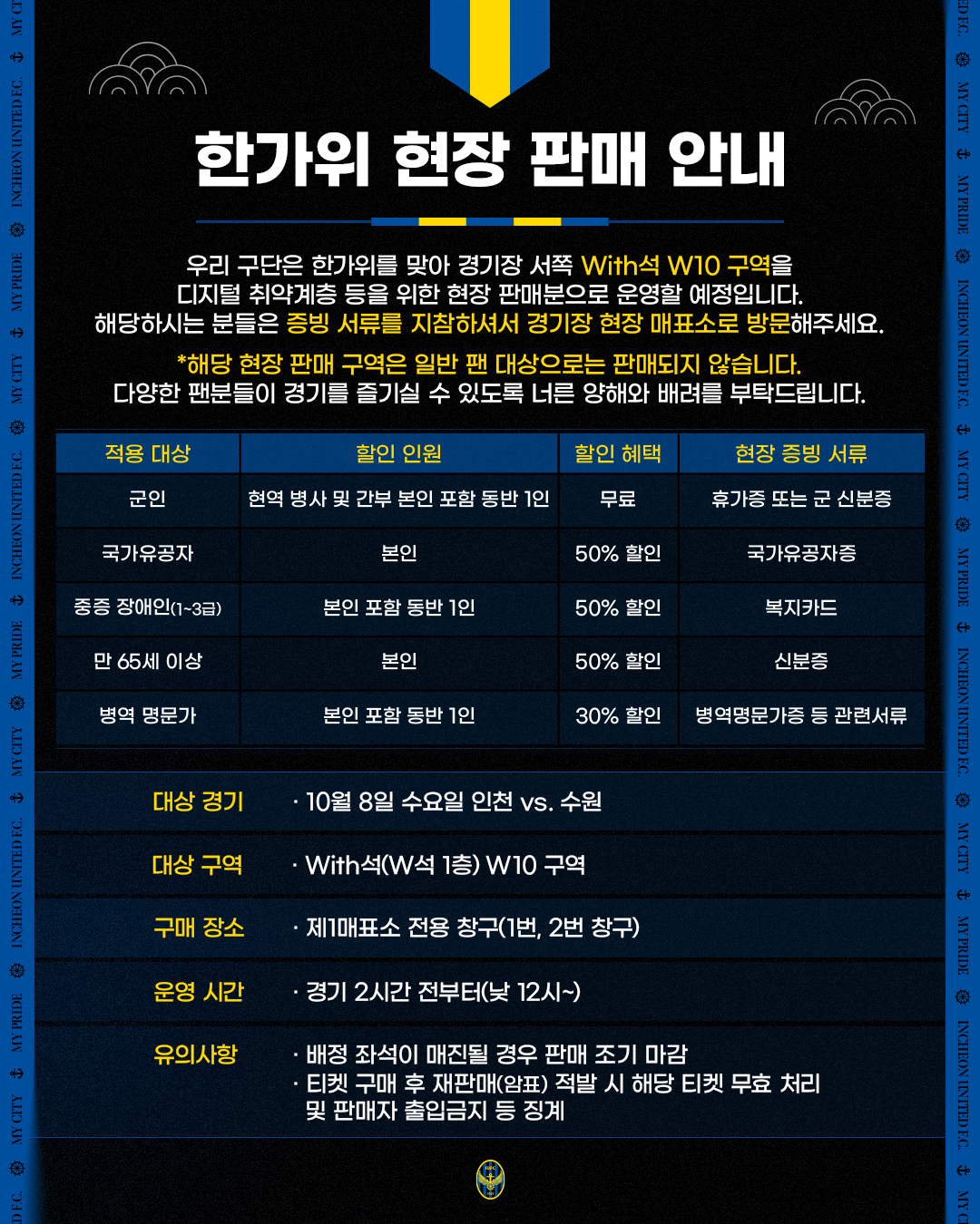 우리 구단은 한가위를 맞아 경기장 서쪽 With석 W10 구역을 디지털 취약계층 등을 위한 현장 판매분으로 운영할 예정입니다.