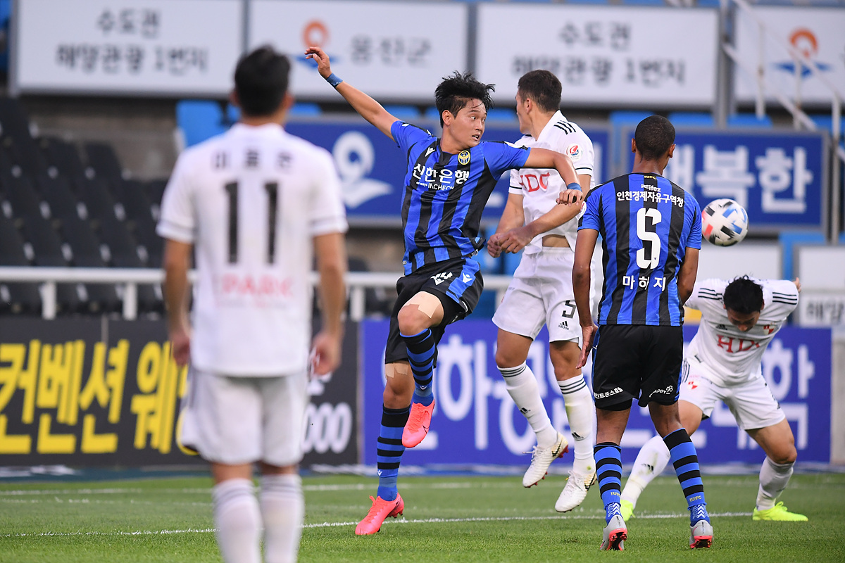 인천도 부산의 약점을 이용해 기회를 창출했다. 공격에 힘을 쏟은 부산 측면 수비수를 상대로 좋은 장면을 만든 것. 전반 20분, 김성주가 부산 김문환을 앞에 두고 크로스를 올렸다. 무고사가 머리에 공을 맞혔지만, 골문을 살짝 빗겨 나갔다.
