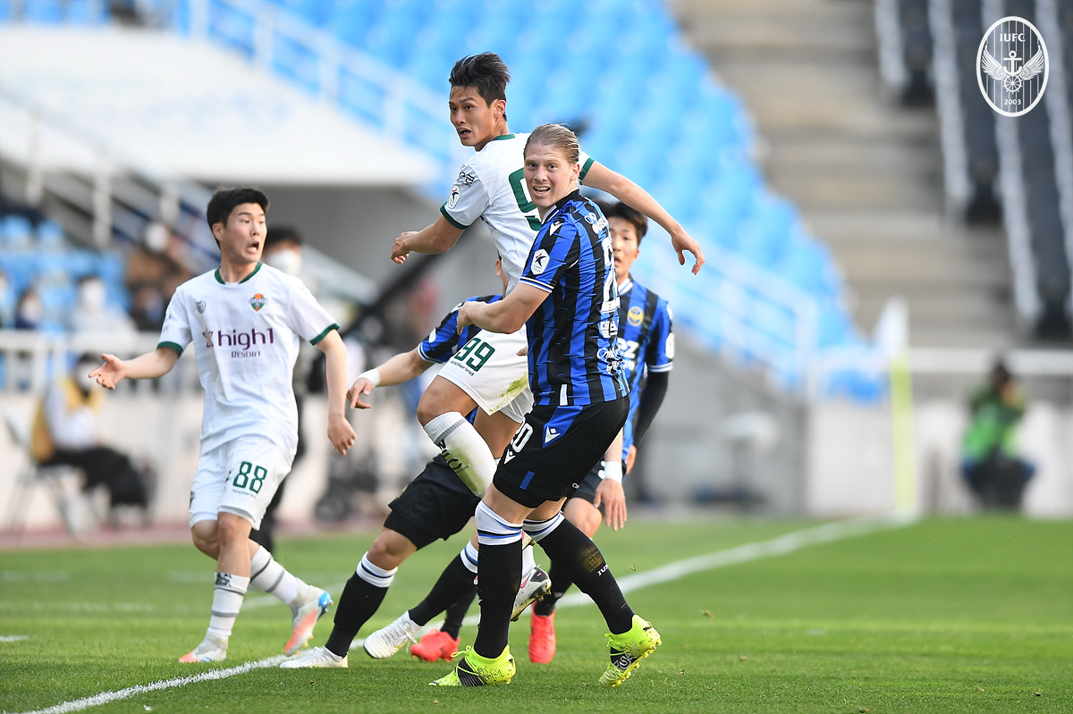 전반 30분 강원의 송준석이 올린 날카로운 크로스를 문전 앞에서 김광석이 몸을 던지며 가까스로 막아냈다. 인천은 42-58(%)로 볼 점유율에서 뒤지고 슈팅을 1개도 기록하지 못했다. 강원은 특유의 점유율 축구로 주도권을 가져갔다. 하지만 인천은 빠른 수비 전환과 짜임새 있는 포지셔닝을 통해 단단한 팀의 모습을 보이며 실점을 허용하지 않았다.
