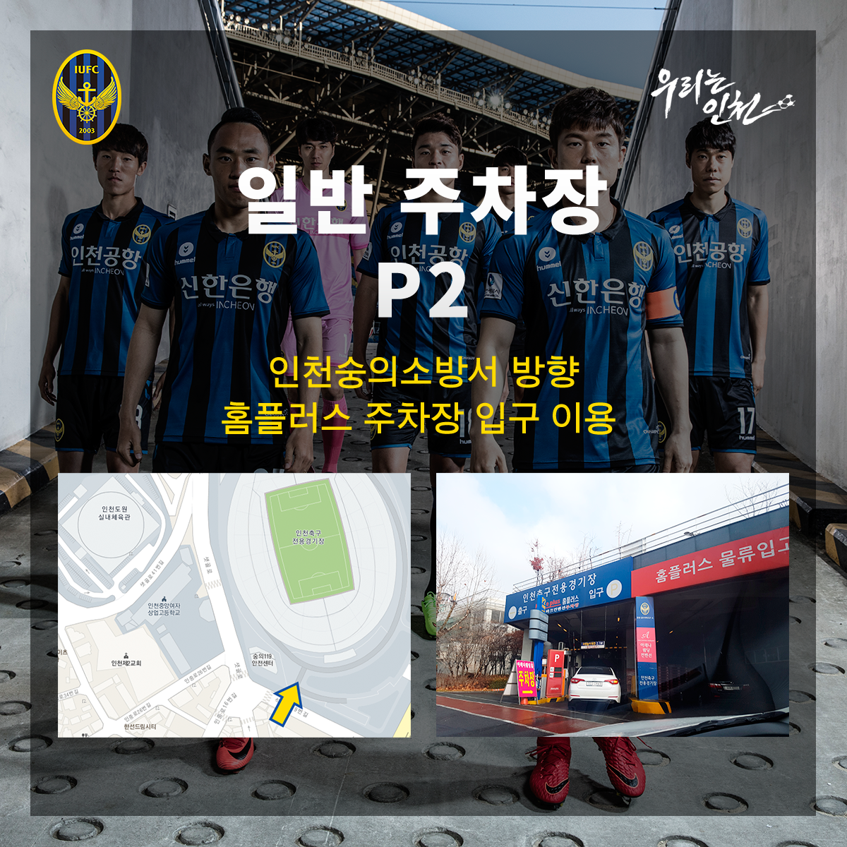 안녕하세요, 인천유나이티드입니다. 3월 10일 전북과의 홈개막전 당일에는 주차장 만차로 인한 큰 혼잡이 예상됩니다. 이에 팬 여러분의 전철, 버스 등 대중교통 이용을 정중히 부탁드리겠습니다. 그럼에도 불구하고 부득이하게 자가용을 이용해 경기장을 찾으실 예정이신 팬 여러분들을 위해 주차장 안내 말씀을 전합니다.