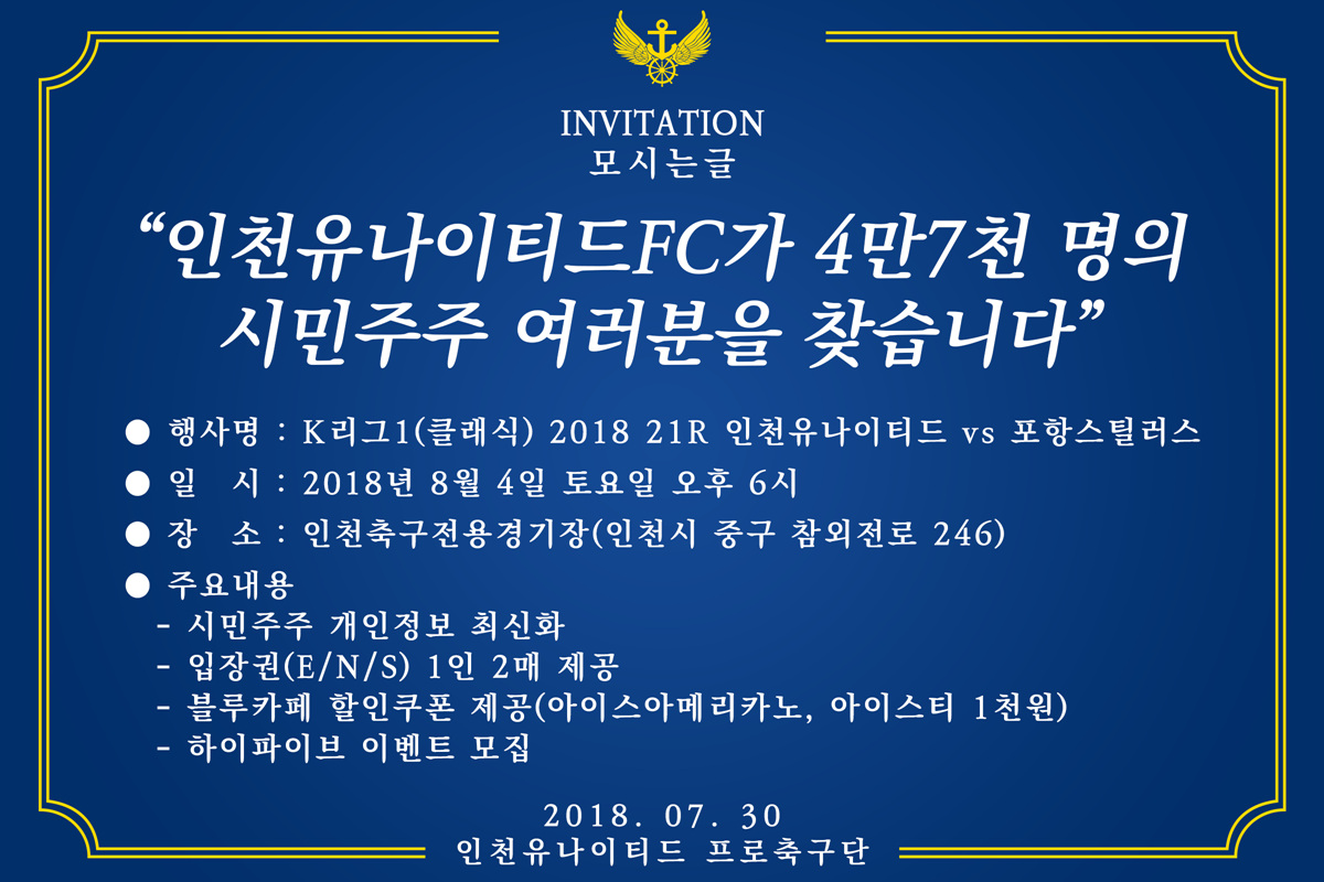 인천유나이티드, 8월 4일 포항전서 시민주주 초청행사 진행