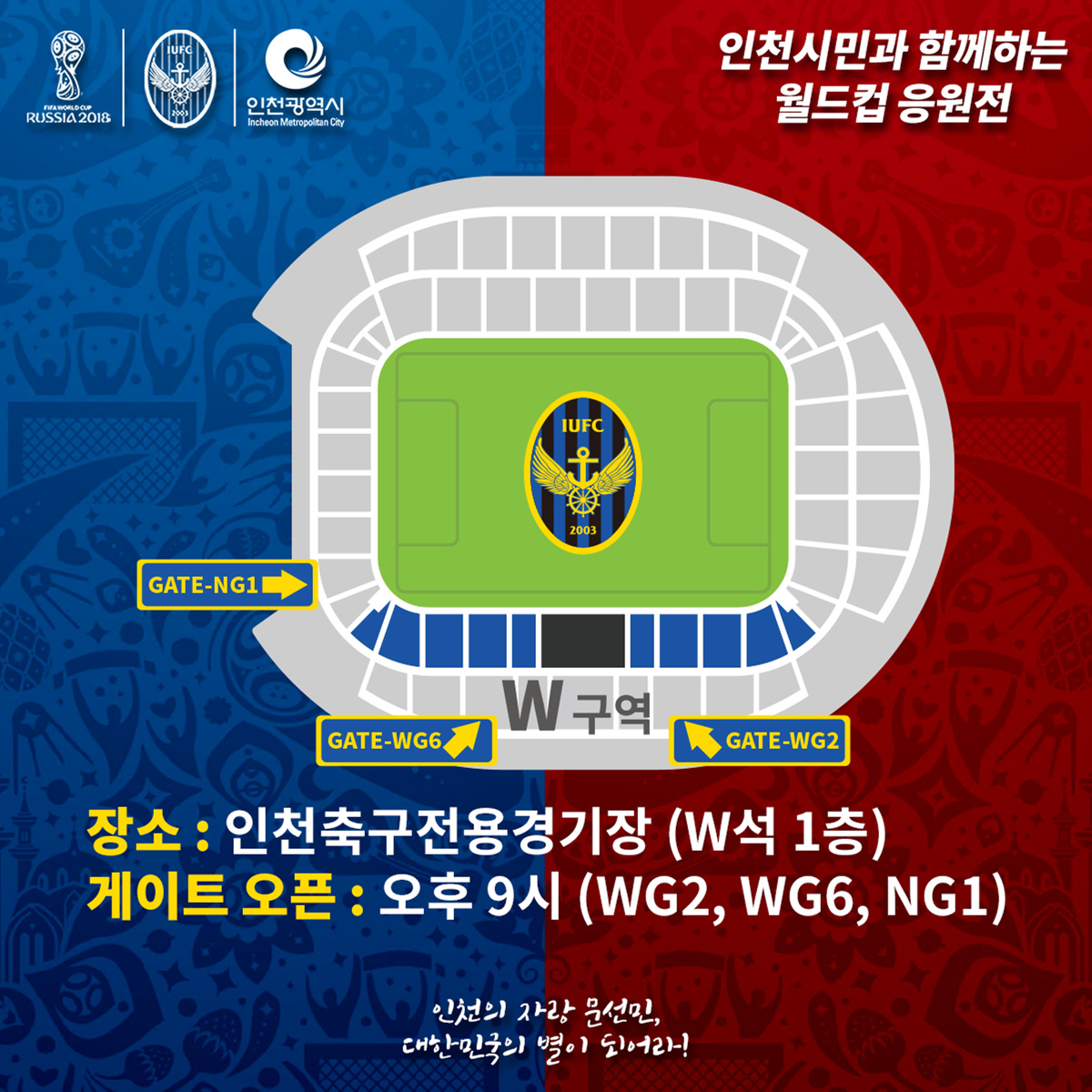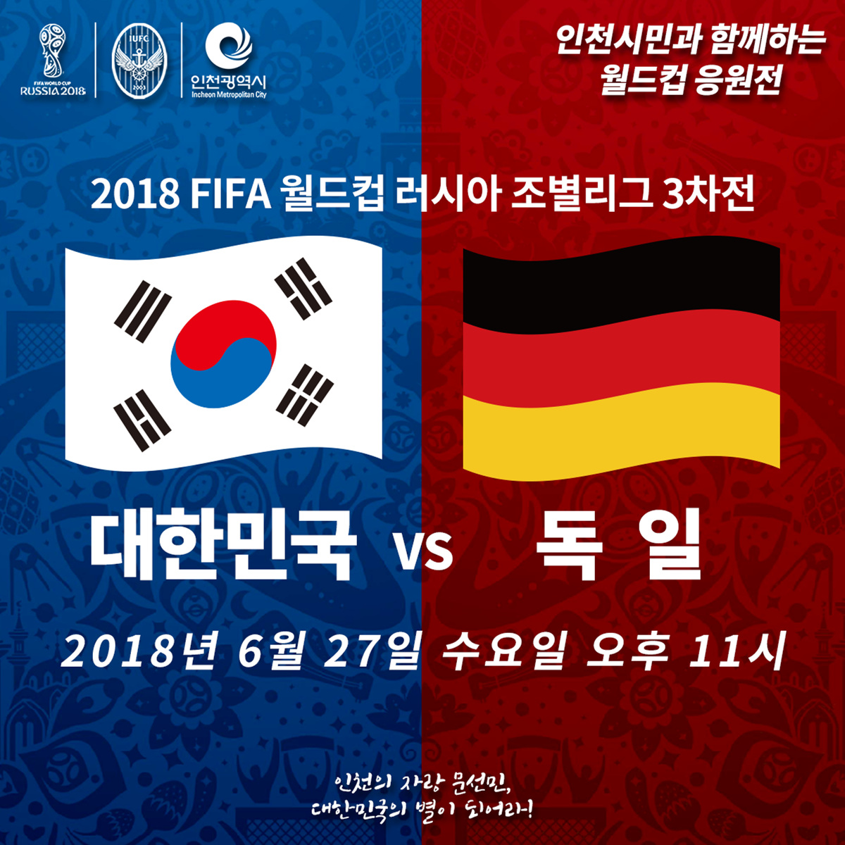 안녕하세요, 인천유나이티드입니다. 6월 27일 수요일 오후 11시 대한민국 축구 대표팀의 ‘2018 FIFA 러시아 월드컵’ 조별예선 3차전 독일전 승리를 기원하며 인천축구전용경기장에서 앞선 1, 2차전과 같이 ‘인천시민과 함께하는 월드컵 응원전’ 행사를 진행합니다. 인천광역시가 주최하고 인천유나이티드FC가 주관하는 이번 행사는 대한민국 축구 대표팀의 월드컵 선전을 기원하며 마련되었습니다.