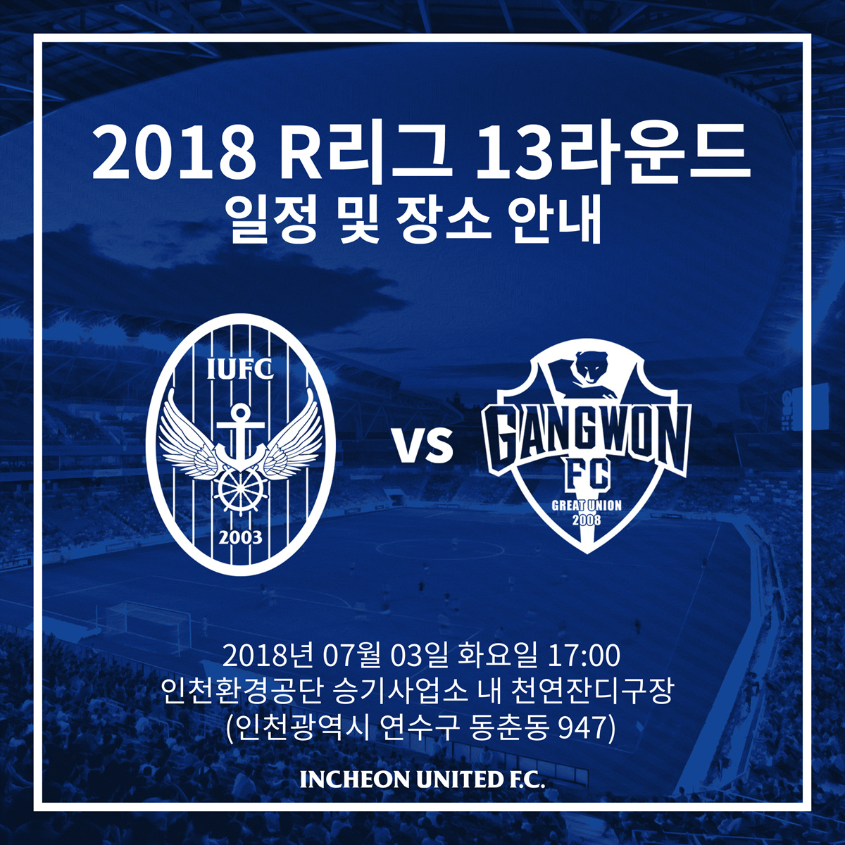 안녕하세요, 인천유나이티드입니다. 7월 3일 화요일 오후 5시 인천환경공단 승기사업소 내 천연잔디구장에서 강원FC와의 R리그 13라운드 홈경기가 진행됩니다.