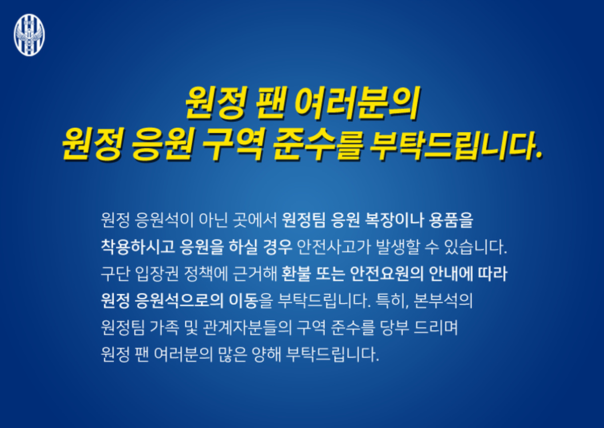 이에 원정 팬 여러분께서는 원정석을 이용해주시길 정중히 부탁드립니다. 만약 원정팬이 원정석 이외의 구역에서 관람하실 경우에는 우리 구단 입장권 정책에 근거해 환불 또는 안전요원의 안내에 따라 원정석으로의 이동 조치가 이뤄질 수 있음을 유념해주시기 바랍니다.