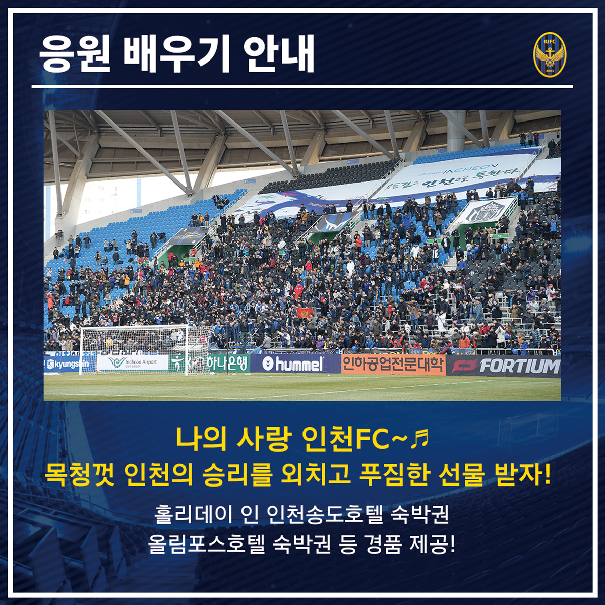 목청껏 인천을 외치고, 푸짐한 경품도 팡! 팡! 올 시즌에도 경기 전 응원배우기 이벤트는 계속 이어집니다. 현장에서 큰 목소리로 함께 호응해주신 분들께 홀리데이 인 인천 송도호텔 숙박권, 올림포스호텔 숙박권 등 다양한 경품을 제공합니다!!! ♬♬♬